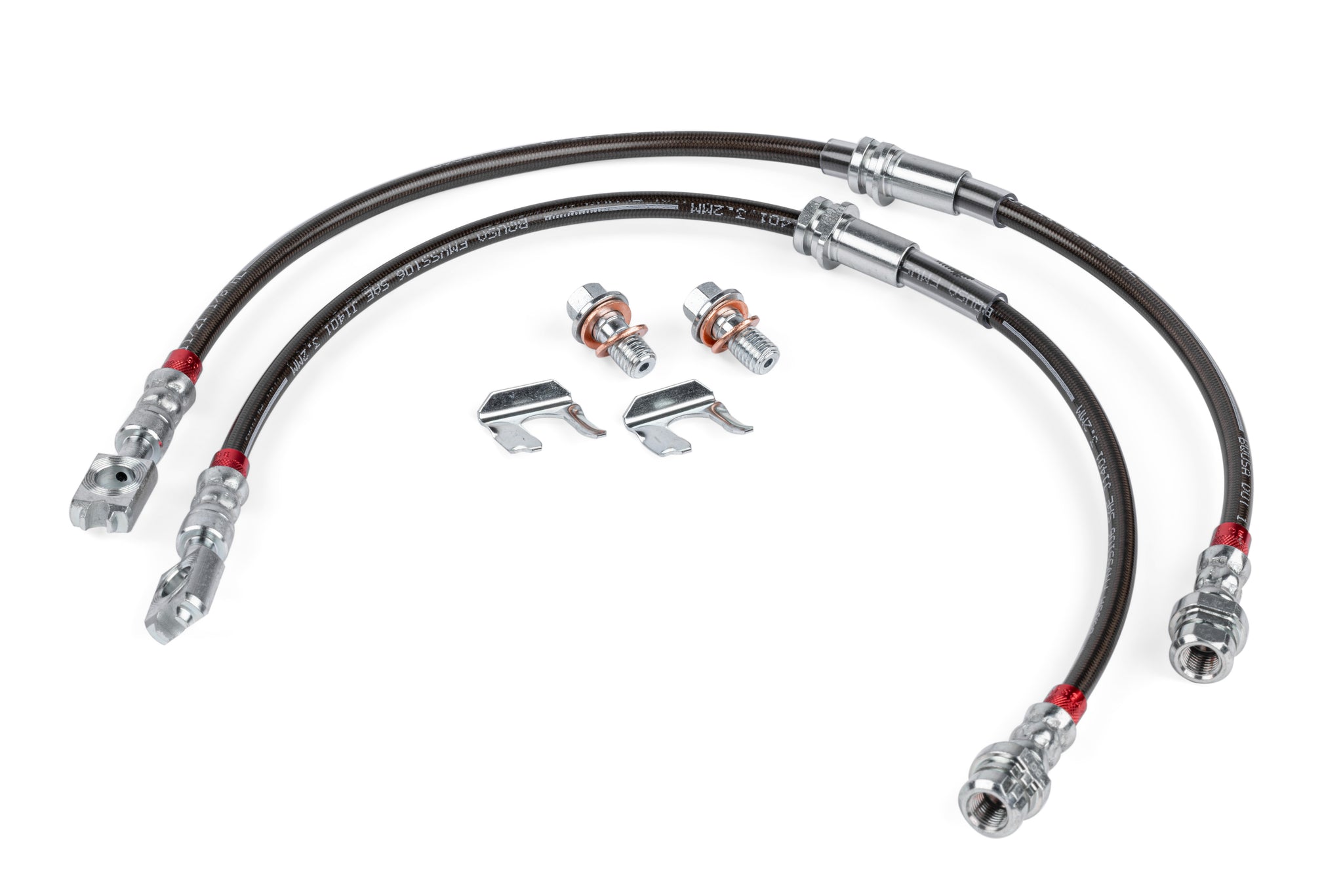 APR Braided Stainless Steel Direct-Fit Brake Line Upgrades are a direct replacement that improves your braking experience with the best lines on the market today. We do away with the factory rubber hoses that expand and can even rupture over time, and replace them with braided 304 stainless steel lines with a smooth-bore Polytetrafluoroethylene (PTFE) / Teflon core that allow for very little expansion. This gives you a firmer brake pedal with less required pedal travel as the fluid gets to its destination faster without all the flex and expansion that happens with lower quality lines. Unlike many universal lines on the market that often use connector adapters, ours are application specific with the correct length and hose fittings, eliminating potential leak points. The lines have an attractive polyvinyl chloride (PVC) outer jacket in smoked clear so you can see the braided lines from within, with red anodized inserts, and Cr3+ steel connectors. Each brake line is fully tested to 3,000 psi prior to sale, which is far beyond typical operating pressures. The lines are independently certified as SAE "low-expansion" lines and average only 0.07 cc/ft @ 1,000 psi and 0.11 cc/ft at 2,900 psi! They are compatible with DOT 3, 4, 5 (silicone-based), and 5.1 brake fluids, are fully DOT-compliant, and meet FMVSS106 and SAE J1401 standards. These are the only brake lines you'll ever need!