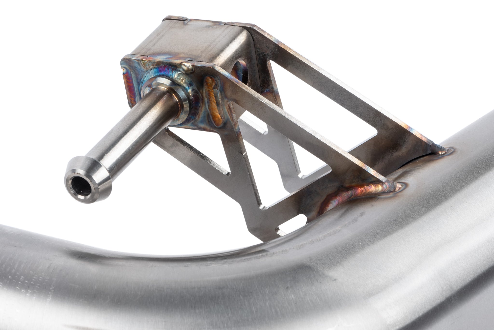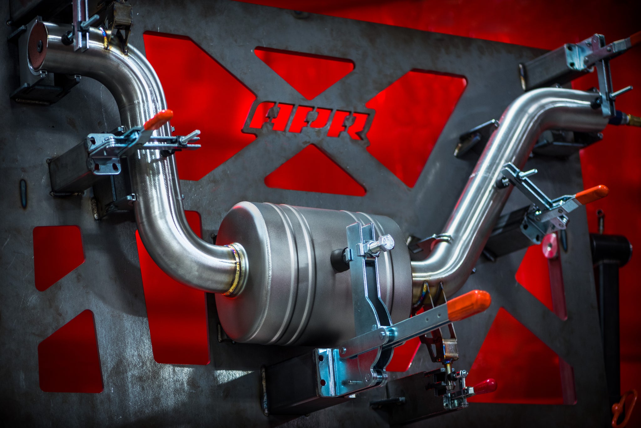 The APR Catback Exhaust System personalizes your vehicle's looks, sound and performance. Beautifully hand-crafted T304-stainless-steel components adorn the system with stunning TIG-welding throughout. Our straight-through brushed-finished muffler smooths the exhaust note to a deep growl, without adding restrictions, rasp or drone. Strong high-quality bracketry and OEM-style clamps hold the system steadily in place, making the install or removal a snap, and fitment simple, yet precise. A cast 3" to dual 2.5" rear splitter creates an ultra-smooth transition, steadily feeding exhaust gasses out of the system, while looking tidy from under the rear bumper. Finally, removable 4" polished slash-cut exhaust tips finish the system, adding a classy motorsport-inspired touch to the rear of the vehicle.
