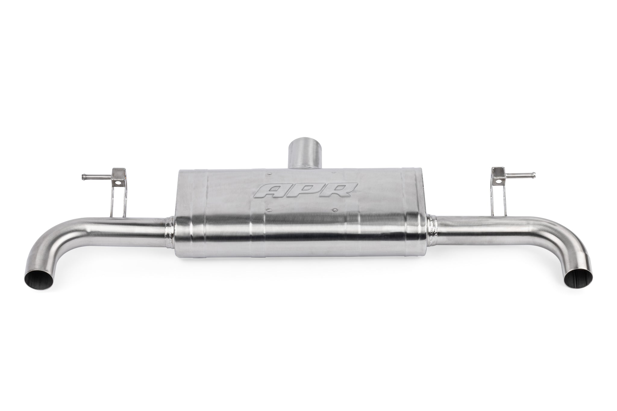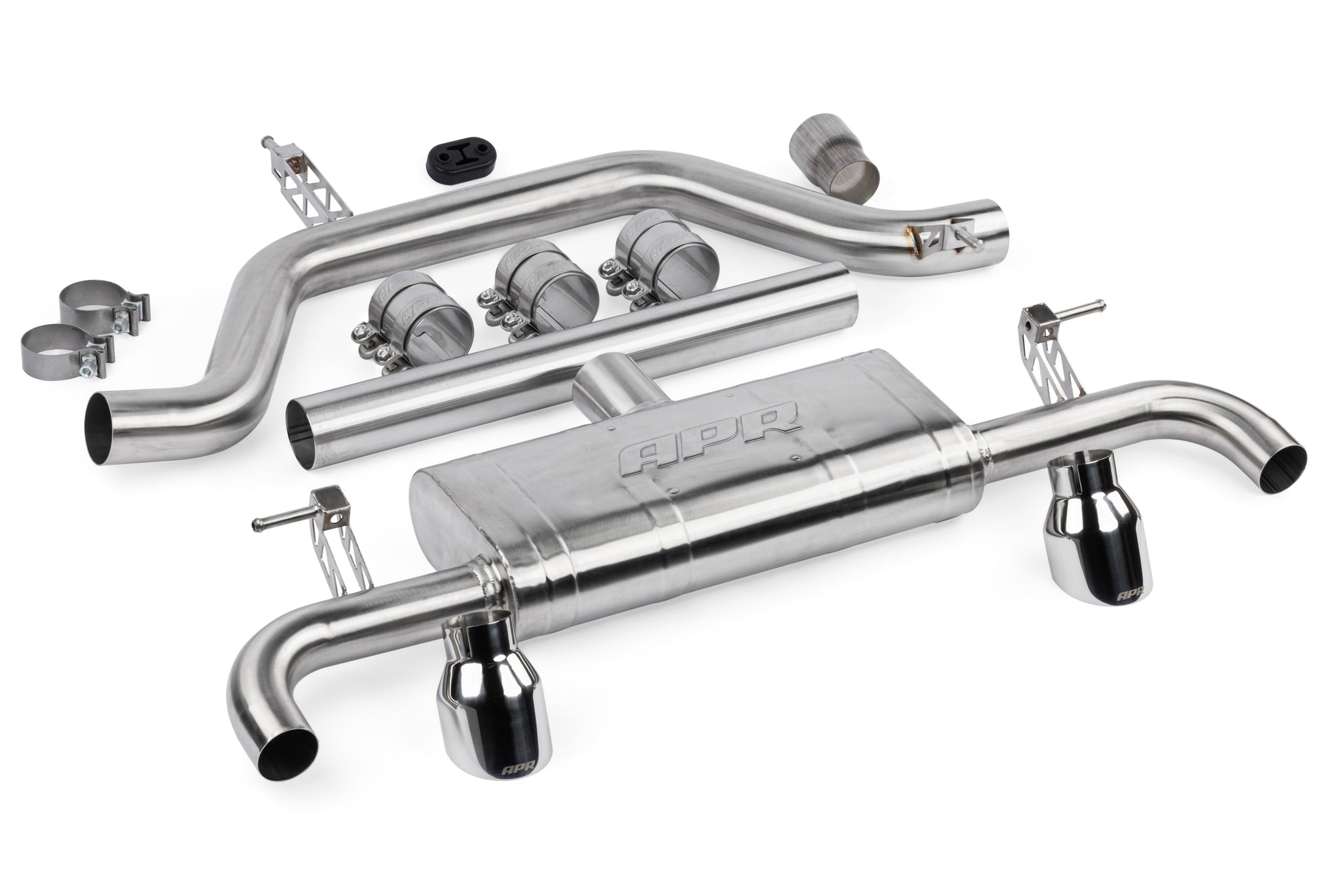 The APR Catback Exhaust System personalizes your vehicle's looks, sound and performance. Beautifully hand-crafted T304-stainless-steel components adorn the system with stunning TIG-welding throughout. Our straight-through brushed-finished mufflers smooth the exhaust note to a deep growl, without adding restrictions or rasp. Strong high-quality bracketry and OEM-style clamps hold the system steadily in place, making the install or removal a snap, and fitment simple, yet precise. 3" (76mm) mandrel-bent exhaust paths provide an ultra-smooth path, steadily feeding exhaust gasses out of the dual 2.5" (63.5mm) exit pipes, while looking tidy from under the rear bumper. Finally, removable 4" (102mm) polished slash-cut exhaust tips finish the system, adding a classy motorsport-inspired touch to the rear of the vehicle.