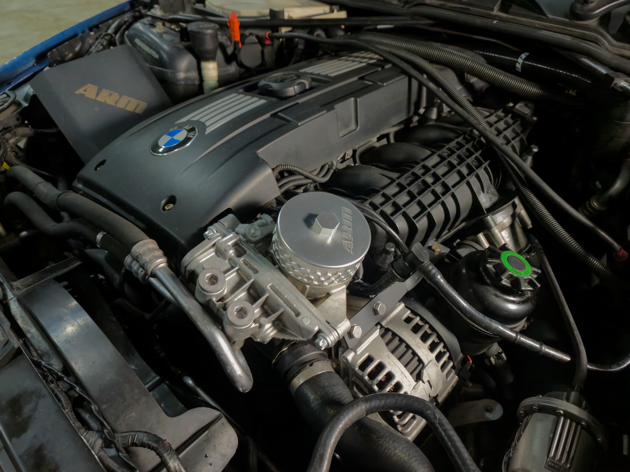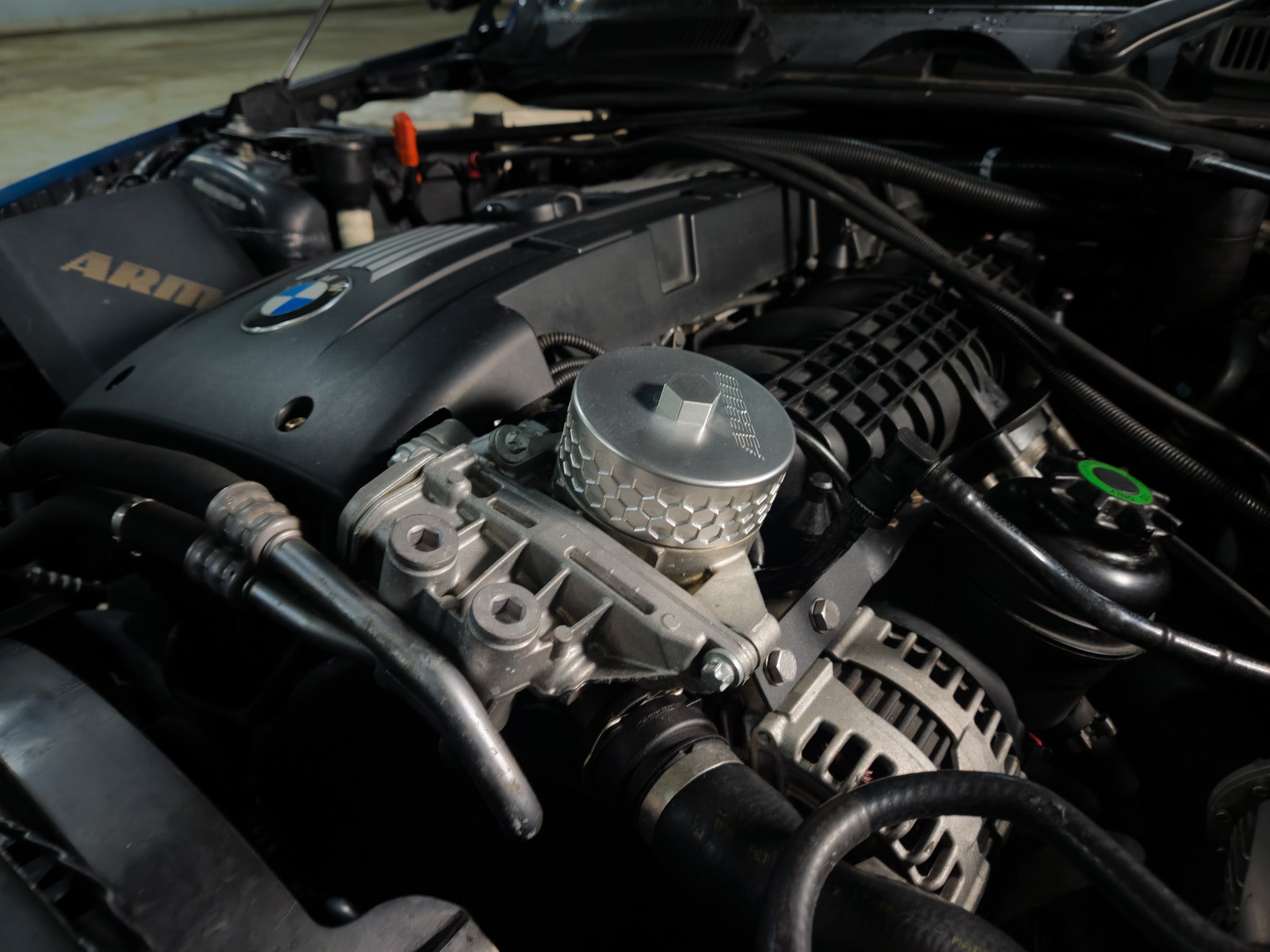 The ARM Billet Aluminum Oil Filter Cap is a direct replacement for the OEM plastic oil cap BMW uses. The ARM Billet Aluminum Oil Filter Cap was designed with practicality in mind. Unlike the plastic OEM cap, which requires a specialized filter wrench that can be a hassle to work with, this cap features a 21mm hex head. This design makes it compatible with a standard socket or wrench, making oil filter changes simpler and more convenient.
