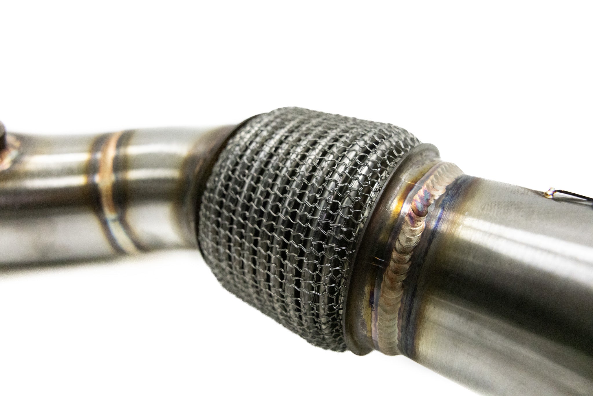 The ARM N63 Catless Downpipes are compatible with the cars on the list below that have a 2-Bolt style OEM downpipe only. The most reliable and accurate way is to simply look under your vehicle for the connection point between the downpipe and mid pipe. In most cases, this is visible without having to remove any undertrays or covers. If your connections look like the images below and your car is listed on the fitment chart, these will fit your vehicle.