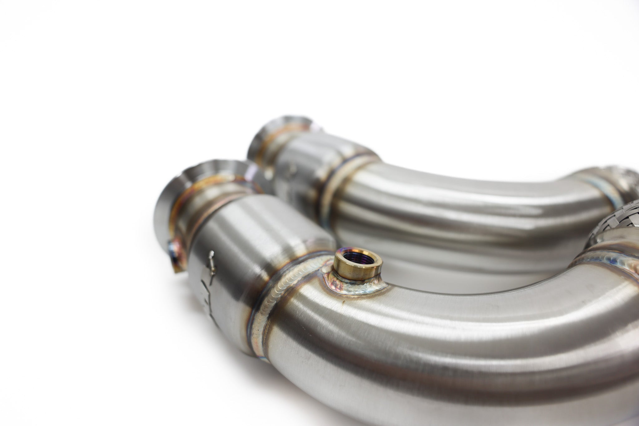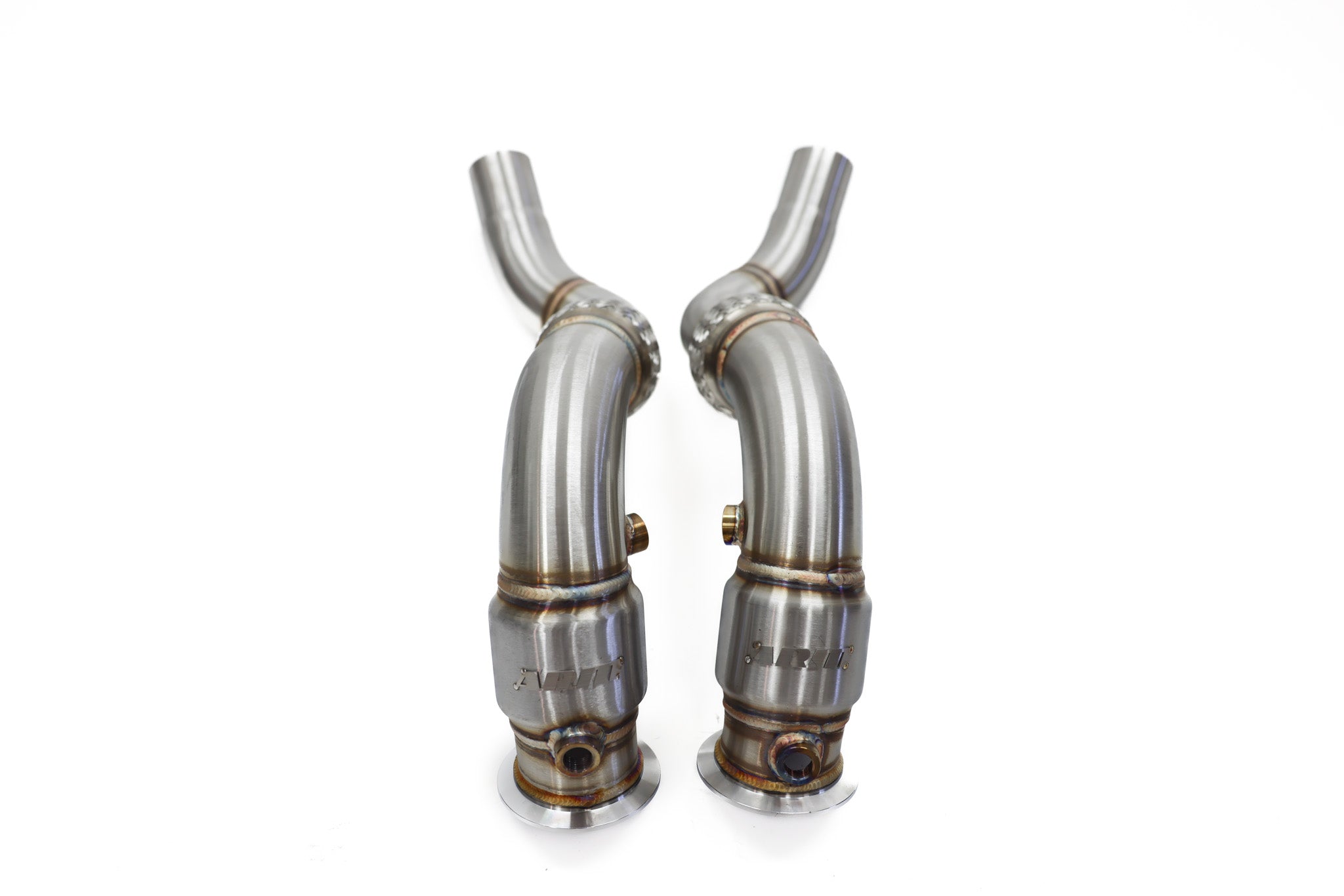 The ARM N63 Catted Downpipes utilize two O2 sensor bungs on each downpipe to allow for reinstalling the O2 sensors in their factory locations. This not only allows for the accommodation of the upper factory heat shield, but also allows the correct O2 sensor data to be sent to the DME. This is essential for the DME to properly monitor the parameters in the exhaust that are critical to having your N63 running smoothly.