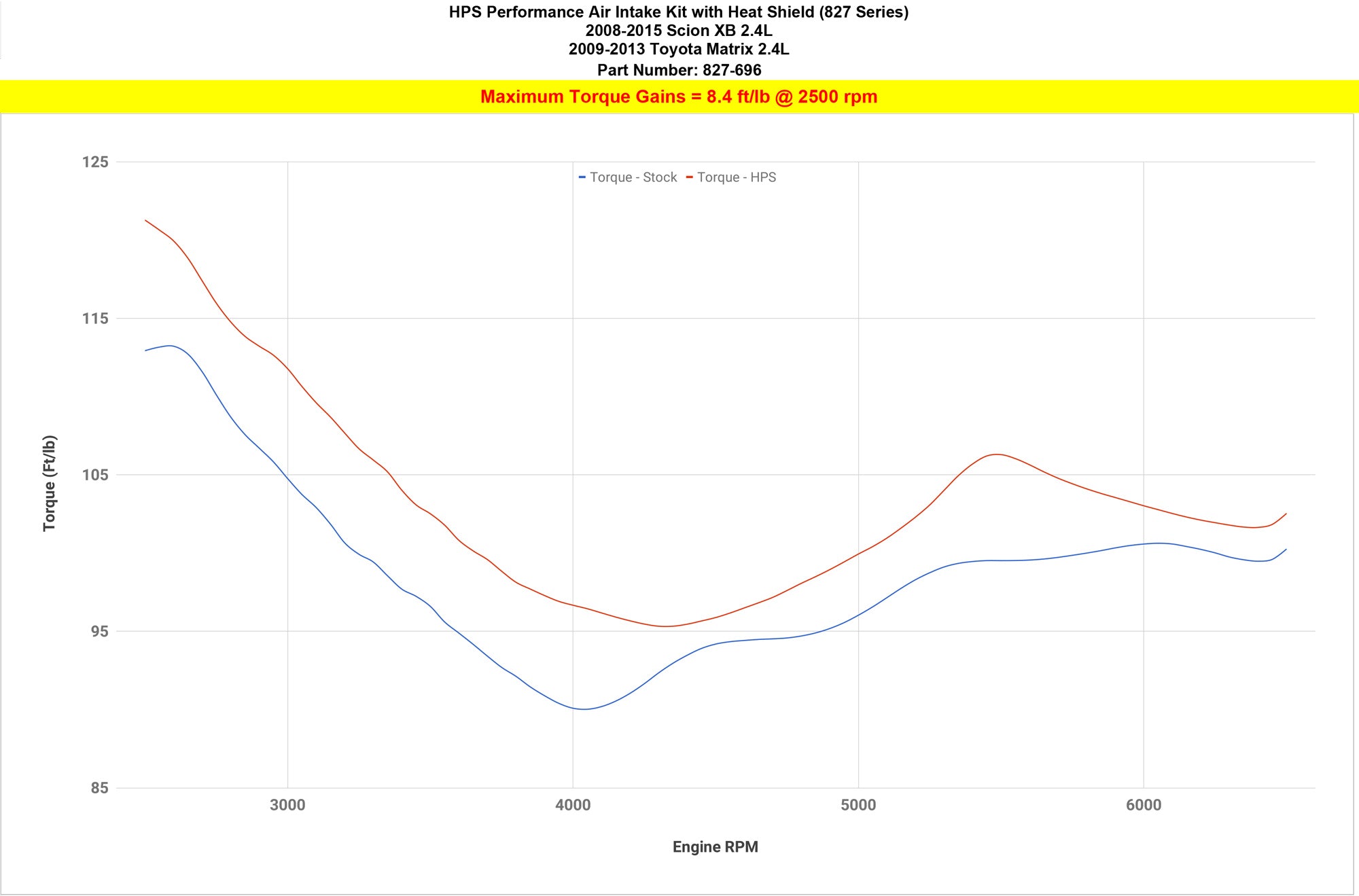 HPS Performance 827 Series air intake kit (Part # 827-696) for Scion 2008-2015 xB 2.4L offers a free-flowing 3 inch mandrel-bent aluminum tube induction system designed to produce dyno proven performance gains - increase horsepower +7.1 whp , torque +8.4 ft/lbs and improve throttle response while maintaining safe air fuel ratio. The heavy duty powder coated steel heat shield blocks hot air from the air filter for the best cooling effect. The included installation manual has clear pictures and instructions to guide the installer throughout the whole process. The kit does NOT require tuning and does not trigger CEL light. No modification is required during the installation. HPS light weight mandrel-bent aluminum alloy tube replaces the stock restrictive air box and optimizes the airflow with excellent heat dissipation and long lasting durability. HPS Performance 827 Series shortram cold air intake kit features race proven reinforced silicone hoses and industrial grade 100% stainless steel t-bolt clamps which ensures reliability, even during the most extreme driving conditions. Proudly made in the United States, the All-New HPS Performance Air Filter is designed with performance in mind, delivering excellent filtration without sacrificing airflow.