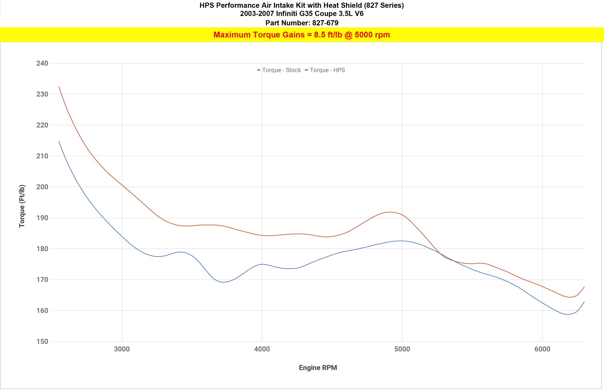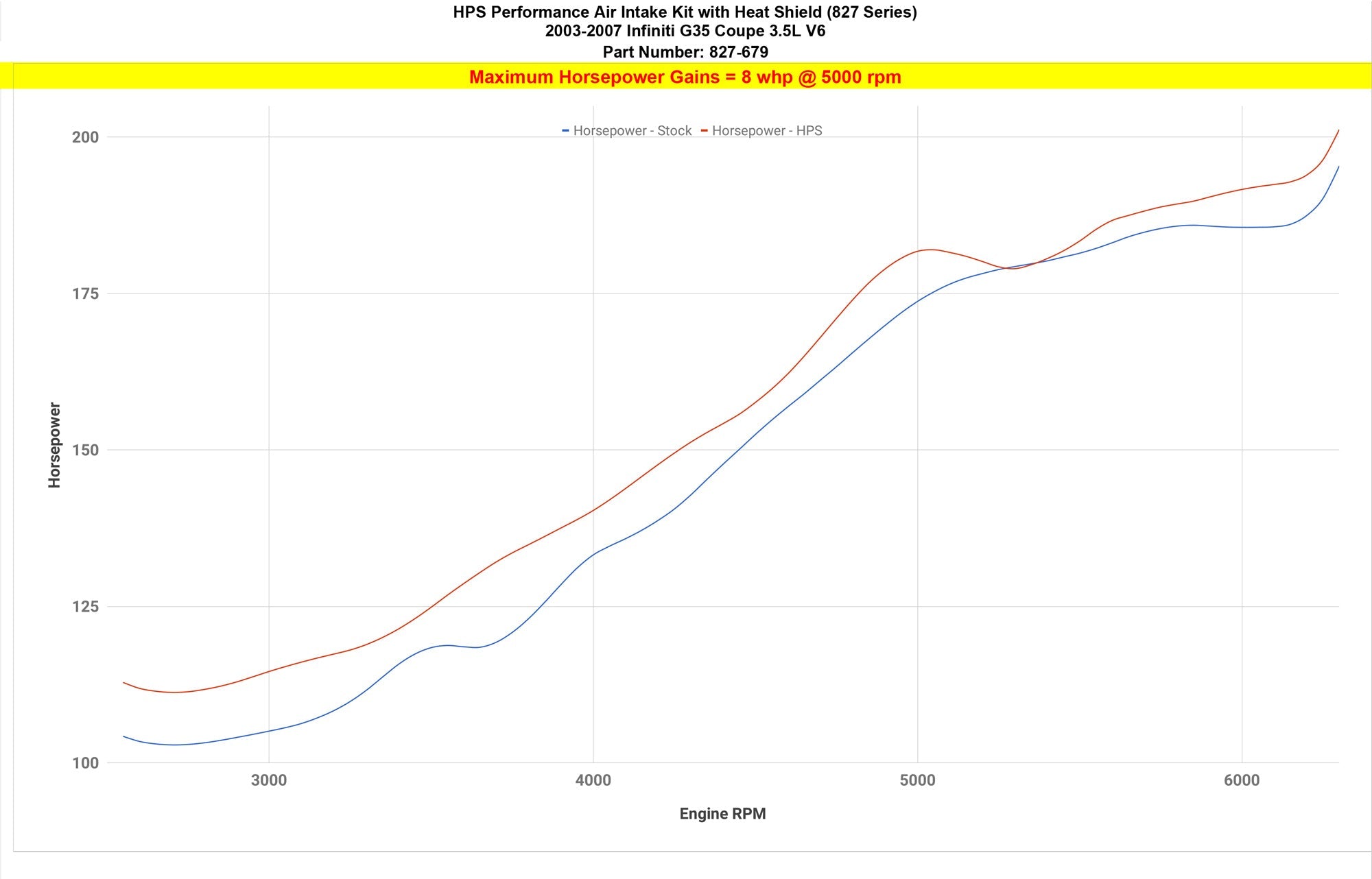HPS Performance 827 Series air intake kit (Part # 827-679) for 2003-2007 Infiniti G35 Coupe 3.5L V6 offers a free-flowing 3-1/4 inch mandrel-bent aluminum tube induction system designed to produce dyno proven performance gains - increase horsepower +8 whp , torque +8.5 ft/lbs and improve throttle response while maintaining safe air fuel ratio. The heavy duty powder coated steel heat shield blocks out hot air from the engine for the best cooling effect. The included installation manual has clear pictures and instructions to guide the installer throughout the whole process. The kit does NOT require tuning and does not trigger CEL light. No modification is required during the installation. HPS light weight mandrel-bent aluminum alloy tube replaces the stock restrictive air box and optimizes the airflow with excellent heat dissipation and long lasting durability. HPS Performance 827 Series shortram cold air intake kit features race proven reinforced silicone hoses and industrial grade 100% stainless steel t-bolt clamps which ensures reliability, even during the most extreme driving conditions. Proudly made in the United States, the All-New HPS Performance Air Filter is designed with performance in mind, delivering excellent filtration without sacrificing airflow.