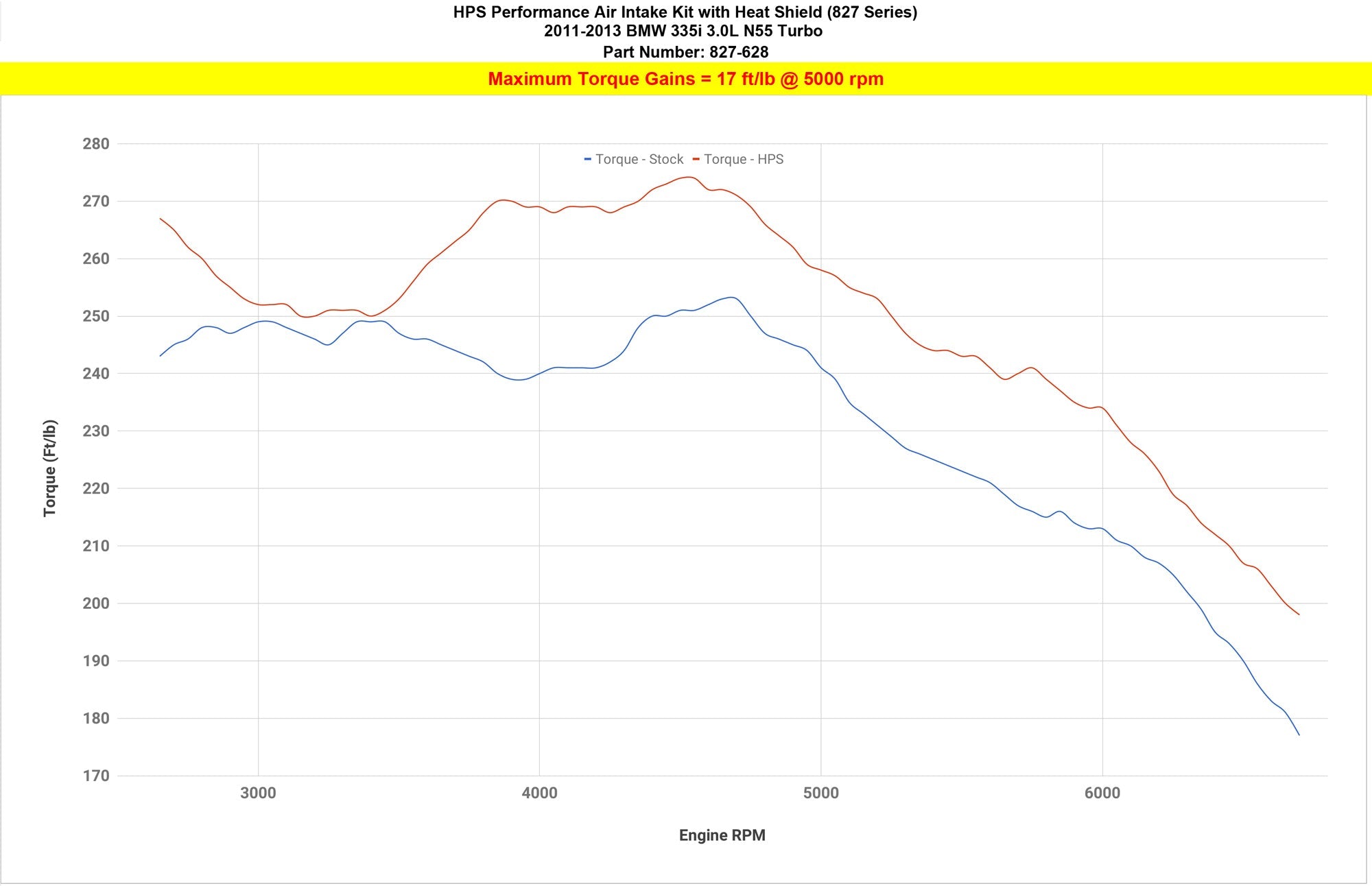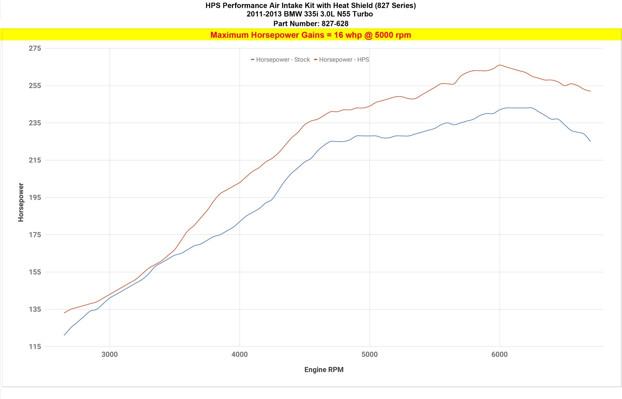 HPS Performance 827 Series air intake kit (Part # 827-628) for 2011-2013 BMW 335i 3.0L Turbo N55 (E90/E92/E93) offers a free-flowing 3 inch mandrel-bent aluminum tube induction system designed to produce dyno proven performance gains - increase horsepower +16 whp , torque +17 ft/lbs and improve throttle response while maintaining safe air fuel ratio. The heavy duty powder coated steel heat shield integrates with the factory fresh air scoop to direct cold air to the air filter for the best cooling effect. The included installation manual has clear pictures and instructions to guide the installer throughout the whole process. The kit does NOT require tuning and does not trigger CEL light. No modification is required during the installation. HPS light weight mandrel-bent aluminum alloy tube replaces the stock restrictive air box and optimizes the airflow with excellent heat dissipation and long lasting durability. HPS Performance 827 Series shortram cold air intake kit features race proven reinforced silicone hoses and industrial grade 100% stainless steel embossed clamps which ensures reliability, even during the most extreme driving conditions. Proudly made in the United States, the All-New HPS Performance Air Filter is designed with performance in mind, delivering excellent filtration without sacrificing airflow.