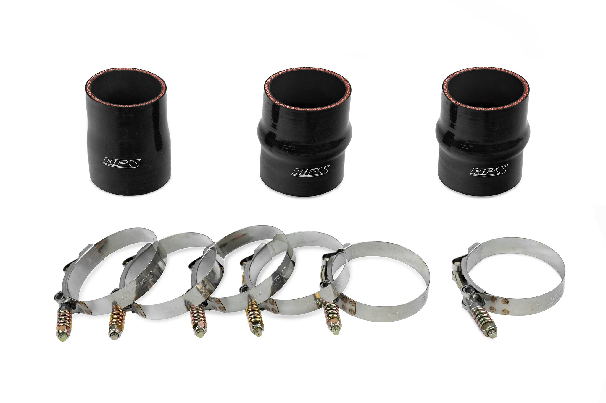 This HPS Performance Hot Side Charge Pipe Kit (Part Number 17-146) with ultra high temperature silicone boots is a simple and effective replacement and performance upgrade from the L5P Duramax restrictive stock intercooler piping (hot side). The 2017-2019 Silverado/Sierra 2500 and 3500 trucks stock intercooler piping is a known weak point in the Duramax's powertrain. With OEM replacements constantly on backorder, a solution for this issue had to be put in place. Replace your defective stock part with an upgrade that won't leave you stranded. Enjoy increased long-term reliability, quicker acceleration, and easier towing. HPS Charge Pipe Kits emphasize easy installation in its design by utilizing 3D modeling during the product's development to ensure a perfect fit. This two-piece kit allows for easier installation while taking into consideration the dynamics under the hood. The larger 3" OD mandrel-bent aluminum piping offers increased air volume and improved airflow. This charge pipe kit includes HPS oil resistant high temperature 4-ply reinforced silicone couplers and heavy duty 100% stainless steel spring loaded T-bolt clamps.