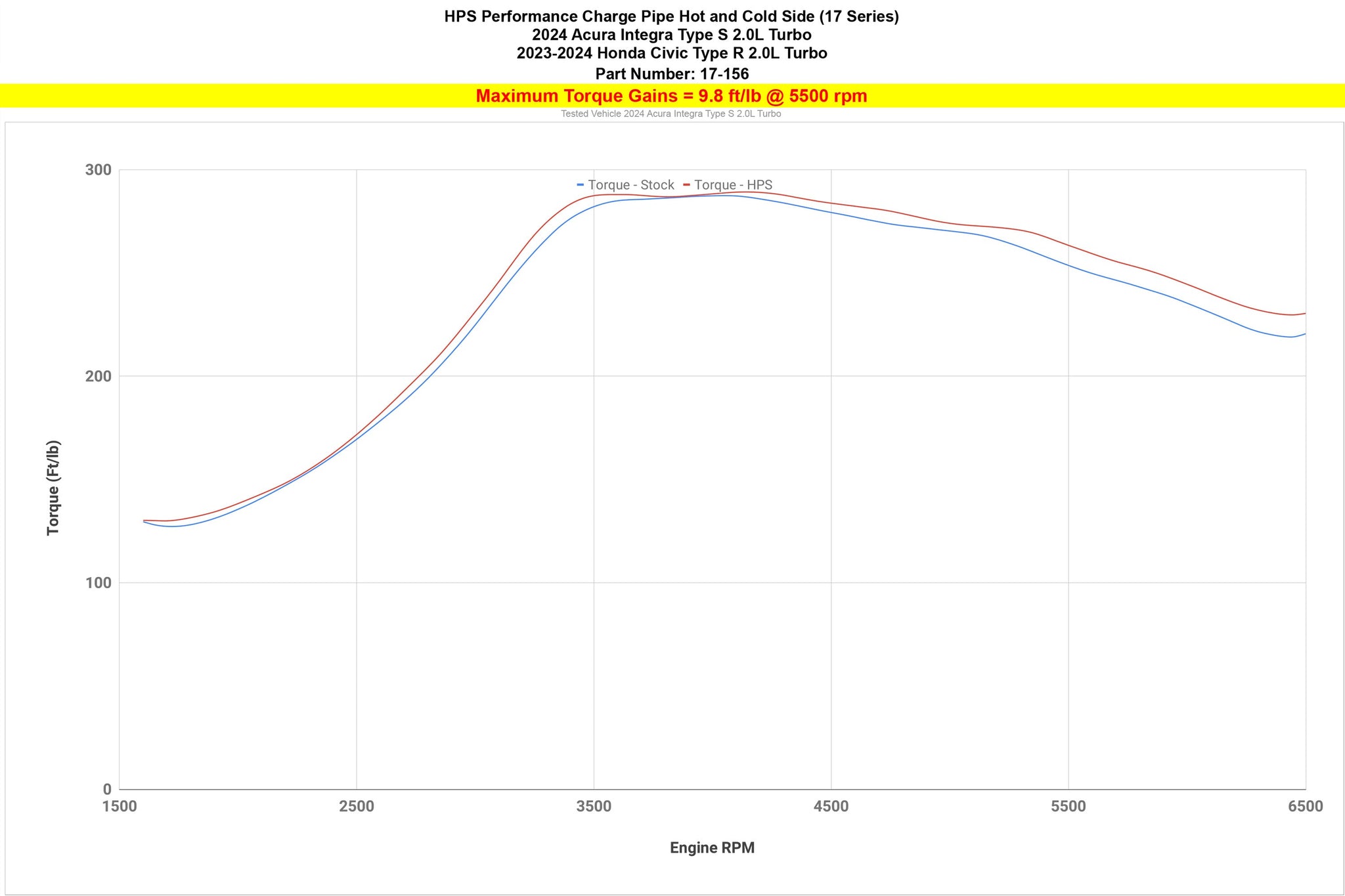 The HPS Performance Charge Pipe Kit, part number 17-156, is a high-quality aftermarket upgrade designed specifically for the Honda Civic Type R FL5 K20C1 Turbo. This kit is engineered to replace the factory charge pipe system, providing significant performance improvements for your vehicle. With a larger 2.5-inch diameter on the cold side and a 2.25-inch diameter on the hot side, the enhanced airflow and reduced restriction increases the engine output by 13 horsepower and 16.6 lb-ft of torque, resulting in improved throttle response, acceleration, and overall engine performance. Constructed with durability in mind, the HPS Performance Charge Pipe Kit is made from 6061 mandrel-bent aluminum to withstand high temperatures and pressure levels, delivering long-lasting performance and resistance to cracking or leaking even under the most demanding driving conditions. To facilitate the installation of sensors and other accessories, a 1/8" NPT bung is included into the design of the upper cold-side charge pipe.