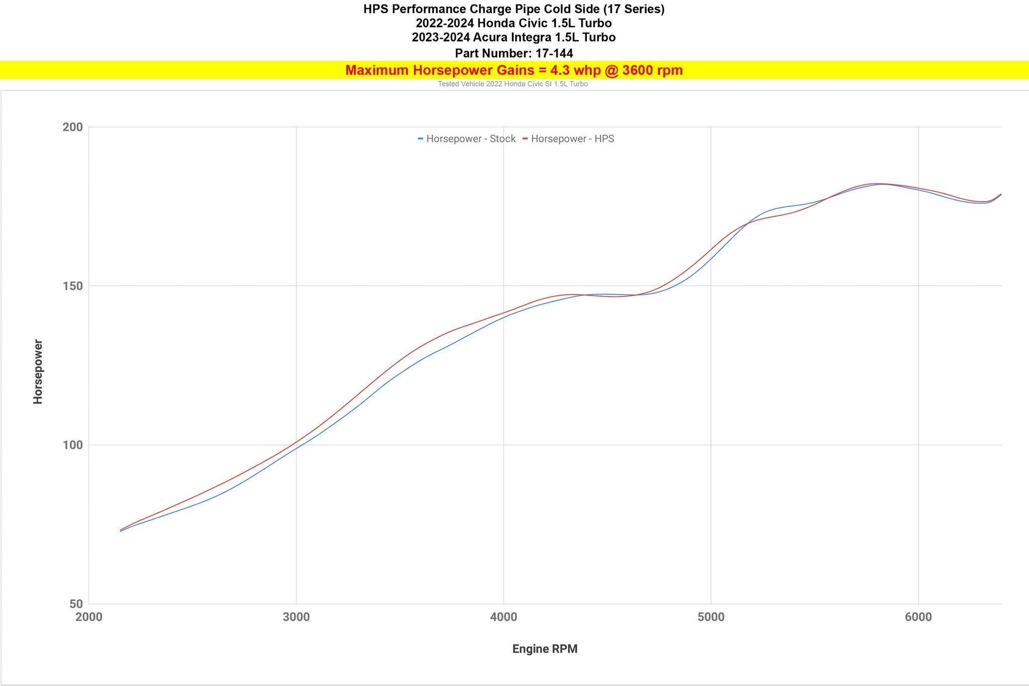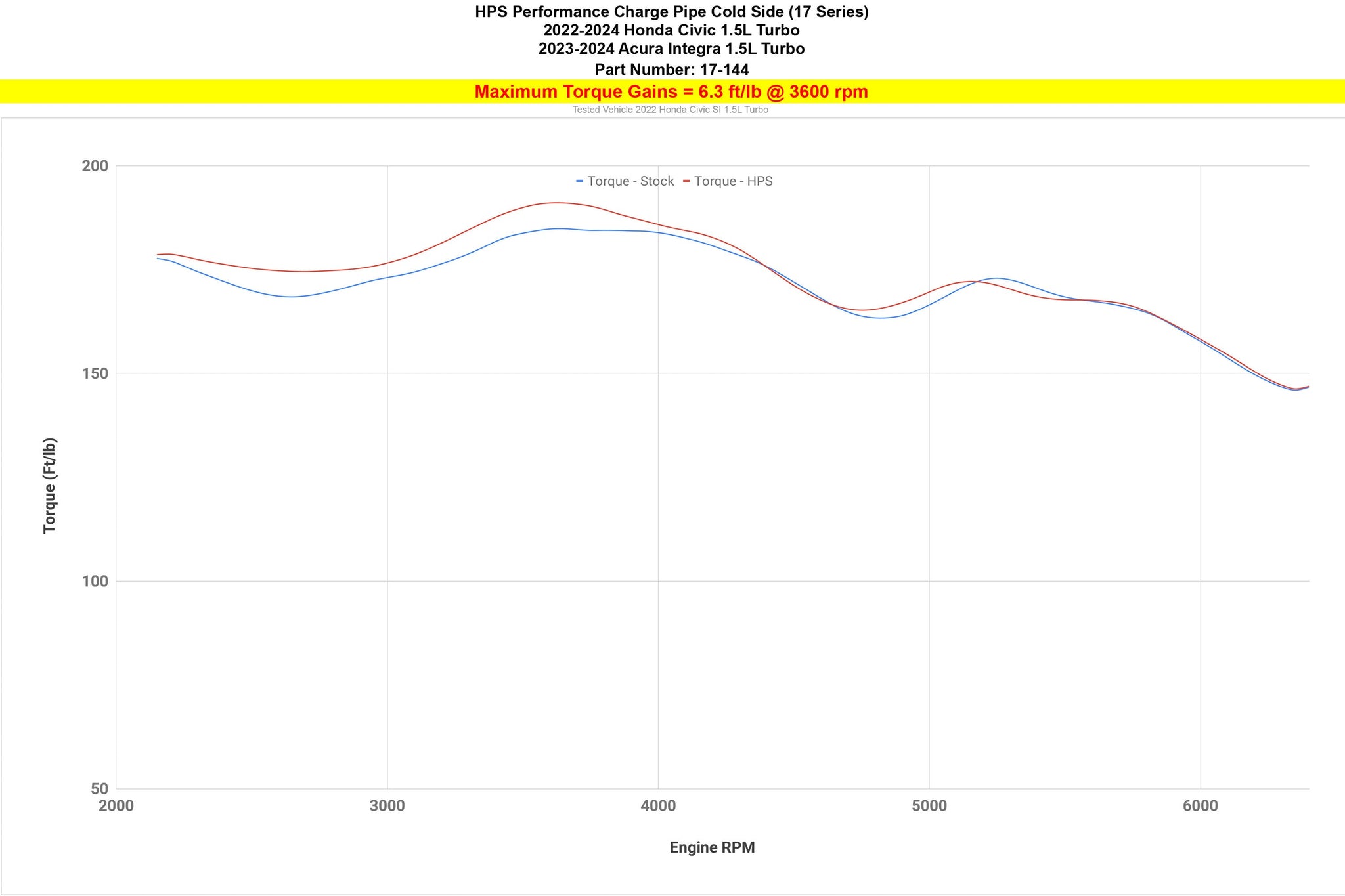 This HPS Performance Cold Side Charge Pipe Kit is a direct upgrade for your 11th Gen Honda Civic Si 1.5L Turbo cold side intercooler piping, replacing the more restrictive and less efficient stock plastic part. The 2.5" mandrel-bent aluminum piping promotes smoother airflow, reducing turbo lag and improving throttle response, and maximizing performance output for quicker acceleration—proven by dyno gains of 4.3 horsepower and 6.3 lb-ft of torque. The kit includes HPS high-temperature-resistant 4-ply reinforced silicone couplers and 100% stainless steel embossed hose clamps to ensure durability in all driving conditions. It is precisely engineered for easy installation, seamlessly integrating into your vehicle without the need for any additional modifications.