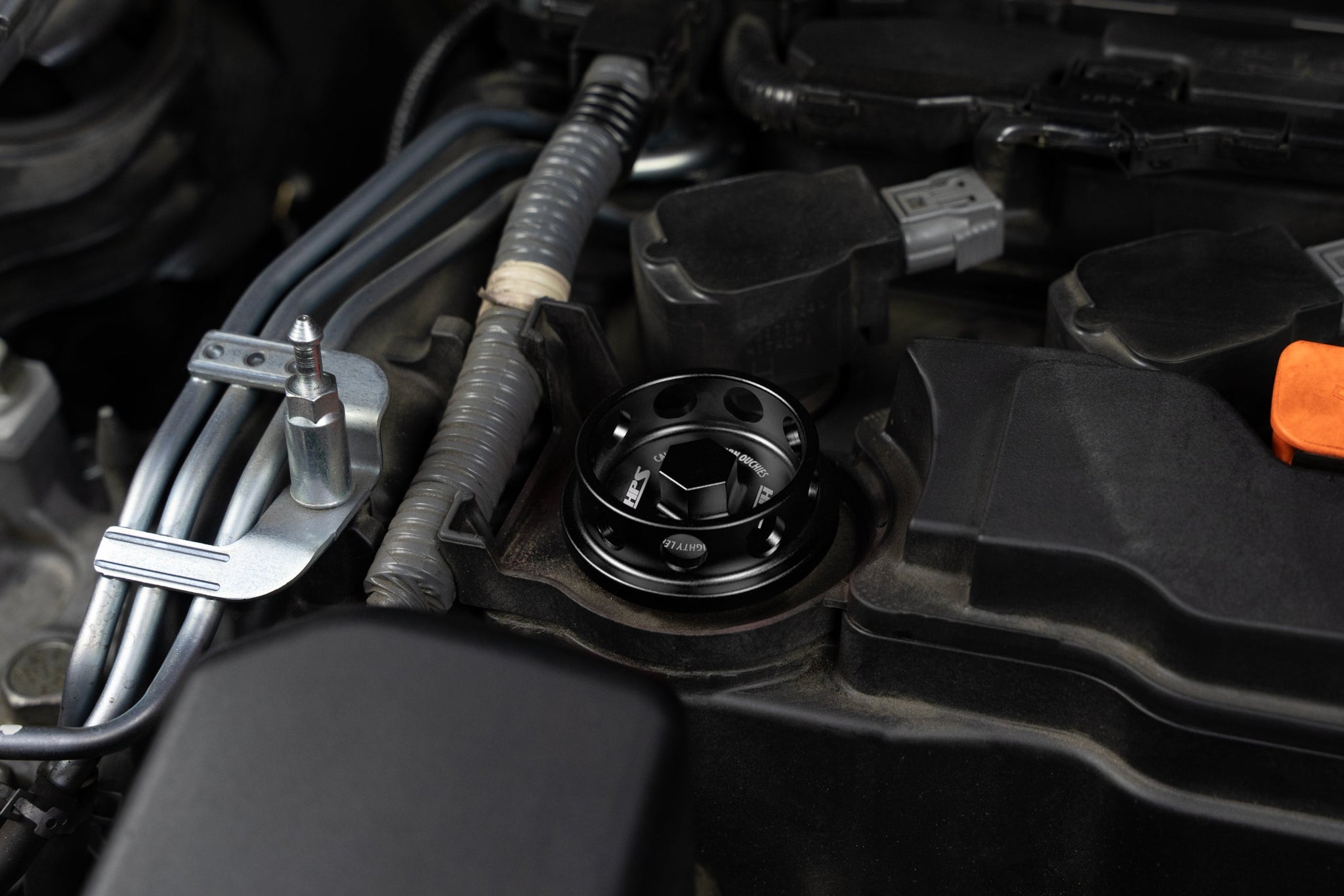 The HPS Performance Anodized Billet Aluminum Black Oil Cap (part number 5269-104WB) for Honda Accord delivers a perfect blend of rugged durability, superior function, and an enhanced engine bay aesthetic. Unlike the stock cap, this isn't molded - it's CNC-machined from solid billet aluminum for unmatched strength and resistance to engine heat. This cap is significantly more dependable and built to last the entire lifespan of your motor, all while giving your Honda Accord engine bay a sharp, high-performance look. This cap features a robust, pre-installed Viton O-ring, a major upgrade from standard rubber that resists extreme heat, harsh chemicals, and oil degradation. That means a far superior and long-lasting seal, preventing oil leaks and maintaining crucial crankcase pressure even when you're pushing the engine hardest. It's designed this for guys who wrench on their own cars. The ergonomic seven-hole pattern ensures a comfortable and secure grip for hand-tightening, but for removal, it's engineered for easy leverage. The cap accepts a 14mm or 9/16" socket, and the offset grip holes are precisely calibrated to let a screwdriver slip through, giving you the extra force needed to effortlessly loosen a stubborn cap. This is the ultimate choice for enthusiasts demanding dependable performance and a striking visual upgrade.