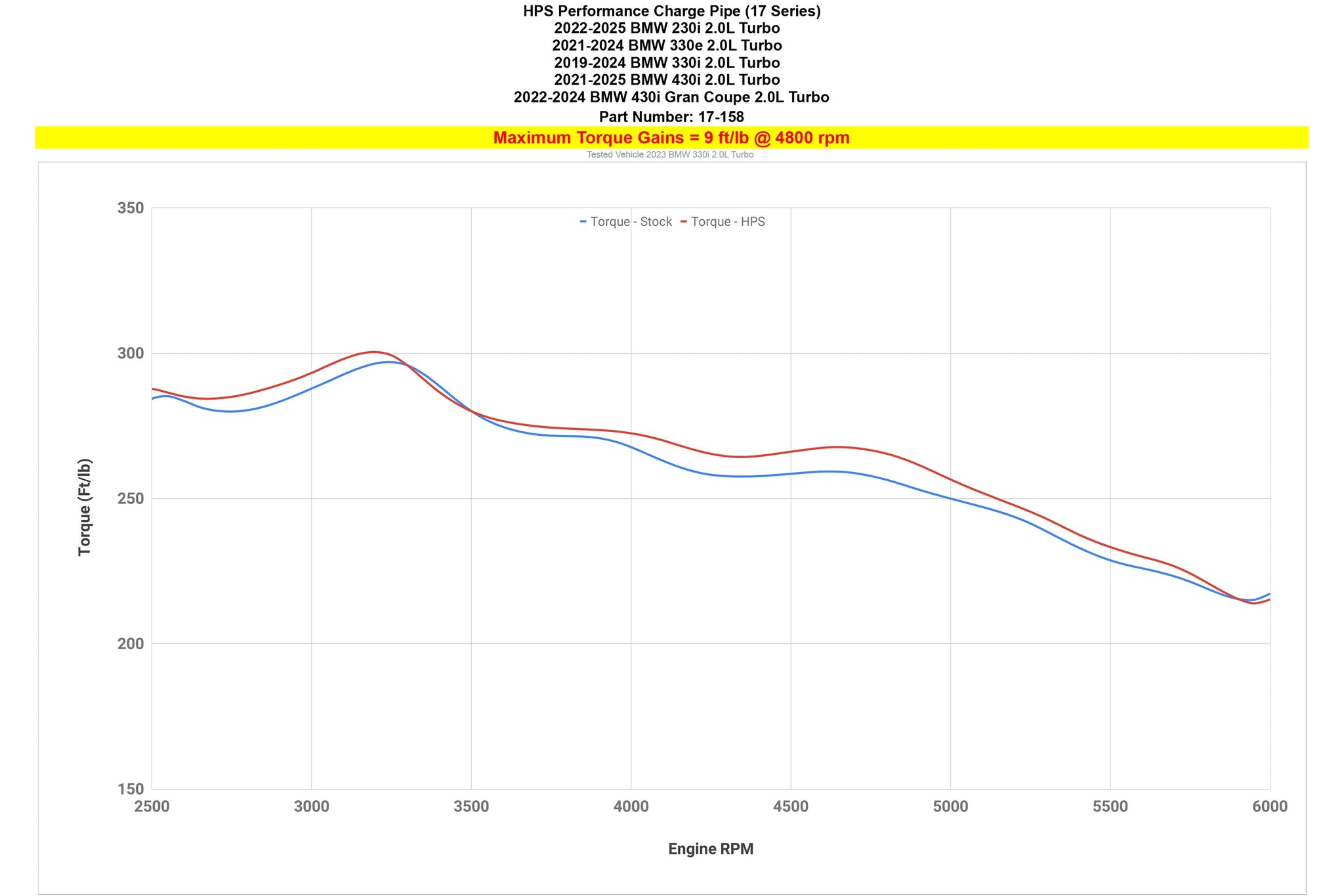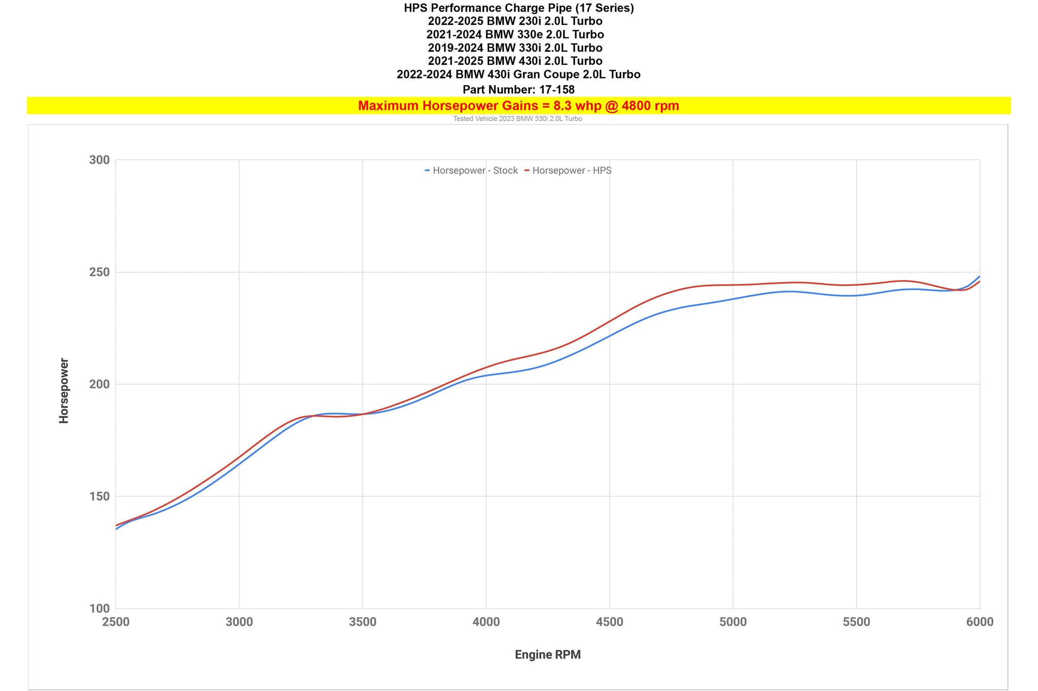 The HPS Performance Charge Pipe Kit (part number 17-158) is engineered to give your 2022-2024 BMW 430i Gran Coupe G26 a thrilling boost in power and responsiveness by delivering dyno-proven gains of additional 8.3 horsepower and 9 lb-ft. of torque. Crafted with superior materials, this charge pipe kit features smooth 3" bead-rolled aluminum piping that surpasses the stock plastic piping in both performance and durability. The high-temperature and high-pressure resistant 3-ply reinforced silicone hump coupler in the kit ensures a secure and long-lasting connection, while the 100% stainless steel T-bolt clamps guarantee a leak-free installation. Designed as a direct replacement for the stock piping, this kit seamlessly integrates into your BMW's engine bay without requiring any additional modifications or tunes. The included 1/8" NPT bung provides a convenient port for future accessories, while the billet aluminum quick connect adapter streamlines the installation process. Experience the perfect blend of performance, durability, and ease of installation with the HPS Performance Charge Pipe Kit. Whether you're taking out on the track or cruising the streets, this upgrade is a must if you're looking to enhance your drive.