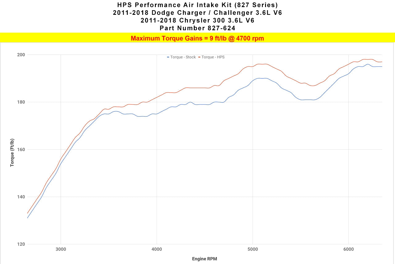 HPS Performance 827 Series air intake kit (Part # 827-624) for 2011-2023 Dodge Challenger 3.6L V6 offers a free-flowing 3-1/2 inch mandrel-bent aluminum tube induction system designed to produce dyno proven performance gains - increase horsepower +8 whp , torque +9 ft/lbs and improve throttle response while maintaining safe air fuel ratio. The heavy duty powder coated steel heat shield blocks hot air from the air filter for the best cooling effect. The included installation manual has clear pictures and instructions to guide the installer throughout the whole process. The kit does NOT require tuning and does not trigger CEL light. No modification is required during the installation. HPS light weight mandrel-bent aluminum alloy tube replaces the stock restrictive air box and optimizes the airflow with excellent heat dissipation and long lasting durability. HPS Performance 827 Series shortram cold air intake kit features race proven reinforced silicone hoses and industrial grade 100% stainless steel t-bolt clamps which ensures reliability, even during the most extreme driving conditions. Proudly made in the United States, the All-New HPS Performance Air Filter is designed with performance in mind, delivering excellent filtration without sacrificing airflow.