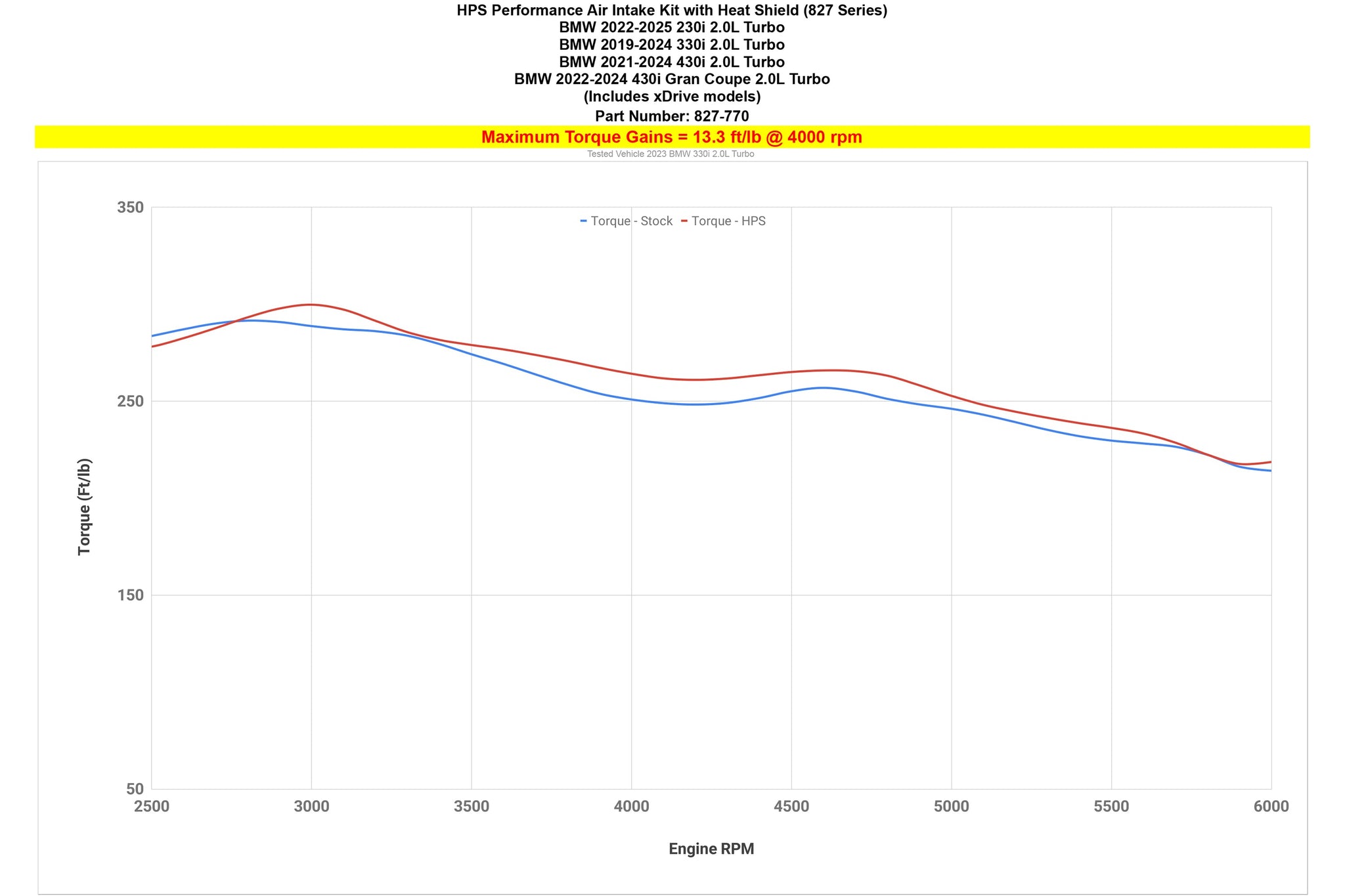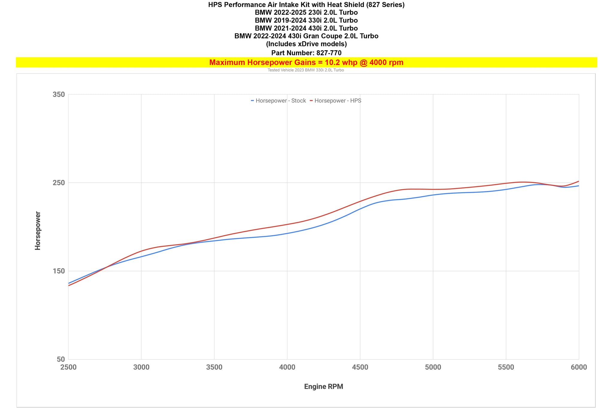 HPS Performance Air Intake Kit with Heat Shield (part number 827-770) is designed to elevate your BMW 430i Gran Coupe Turbo driving experience to new heights by delivering dyno-proven gains of 10.2 horsepower and 13.3 lb-ft. of torque. This premium kit boasts a sleek 3.25" aluminum intake tube, engineered to deliver smoother airflow than the restrictive stock system. Breathe life into your BMW B48 engine with the high-flow washable and reusable pre-oiled cotton air filter, ensuring maximum airflow and filtration efficiency. The included powder-coated steel heat shield with lid safeguards your intake from under-hood heat, optimizing performance. Unlock the perfect blend of power and precision with an HPS signature high-temperature and pressure-resistant reinforced silicone coupler and stainless steel hose clamps, guaranteeing a secure and leak-free connection. The kit's comprehensive design includes all the necessary hardware, allowing for a straightforward installation without any additional modifications or tunes.