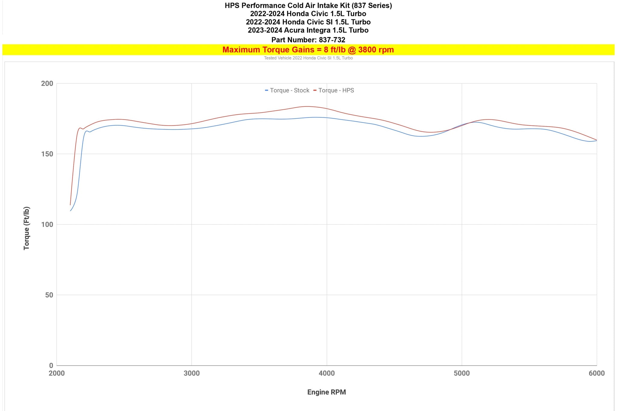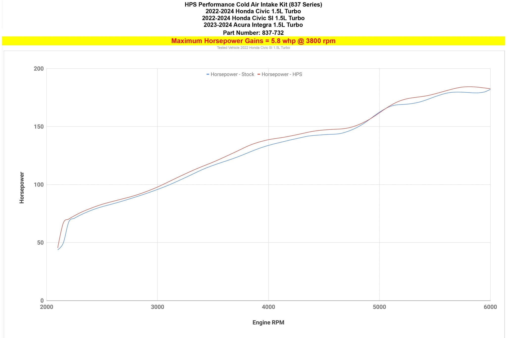 Experience the Power of Performance with the HPS Performance Cold Air Intake Kit (part number 837-732)! Boost your 5th Gen Acura Integra's performance with a 5.8 horsepower and a remarkable 8 lb-ft torque increase. Feel the rush as you accelerate effortlessly down the road! HPS utilizes a 2.75" aluminum intake pipe fine tuned to perfection, delivering unrestricted airflow for maximum power gains. Not only will you feel the power, but you'll hear it too. Enjoy a thrilling engine sound that announces your arrival with authority. HPS reusable, washable high flow air filter not only enhances performance but also reduces waste. Say goodbye to disposable filters and hello to savings and environmental responsibility. With a hassle-free bolt-on installation process, you can transform your ride in no time. No need for professional help. Just follow our step-by-step installation manual and you're on your way. Upgrade your Acura Integra DE4 today and experience the difference with HPS Performance cold air intake kit.