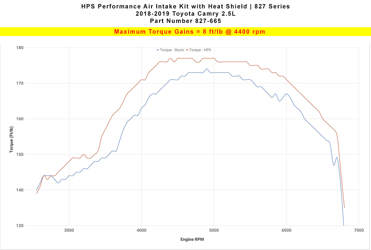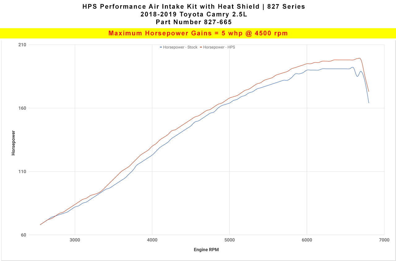 HPS Performance Air Intake Kit (827-665) for 2018-2024 Toyota Camry 2.5L Non Hybrid (A25A-FKS) replaces the factory intake and air filter housing with a 3" custom mandrel-bent aluminum tube and heavy duty powder coated heat shield designed to maximize the performance of this vehicle. It includes a reusable high-flow cotton air filter to provide maximum airflow to increase your engine's output by up to +5 horsepower and +8 lb-ft. of torque for power you can feel through improved throttle response and acceleration. This kit includes both HPS 100% stainless steel T-bolt clamps and silicone coupler that are engineered to withstand the toughest driving conditions. HPS Performance Air Intake Kits are designed and tested using the latest technology to ensure the best performance and fitment.