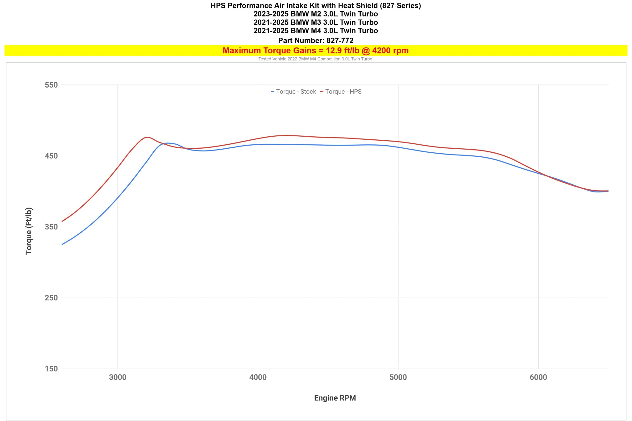 Designed with style and performance in mind, this HPS Performance Air Intake Kit with Heat Shield (part number 827-772P) is engineered to unleash the true potential of your M2 G87 S58 engine, delivering performance gains of up to 10.4 horsepower and 12.9 lb-ft. of torque. Our upgrade delivers razor-sharp throttle response and eliminates that last hint of turbo lag for a truly savage power delivery, transforming your daily commute into an exhilarating ride. Beyond the performance gains, this kit is built to last, featuring a smooth, 3" mandrel-bent aluminum intake pipe, custom molded silicone air intake hose, washable and reusable high-flow cotton air filters, durable reinforced silicone couplers, and robust stainless steel embossed hose clamps. The heavy duty powder coated steel heat shields integrate with the stock air scoops to direct cold air to the air filter. Designed for a straightforward bolt-on installation, this intake system requires no additional tuning or modifications, making it the perfect upgrade for you to elevate your BMW M2 G87 performance.