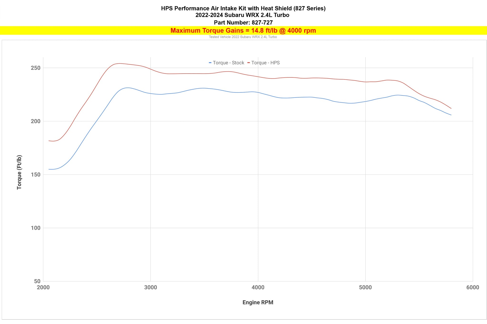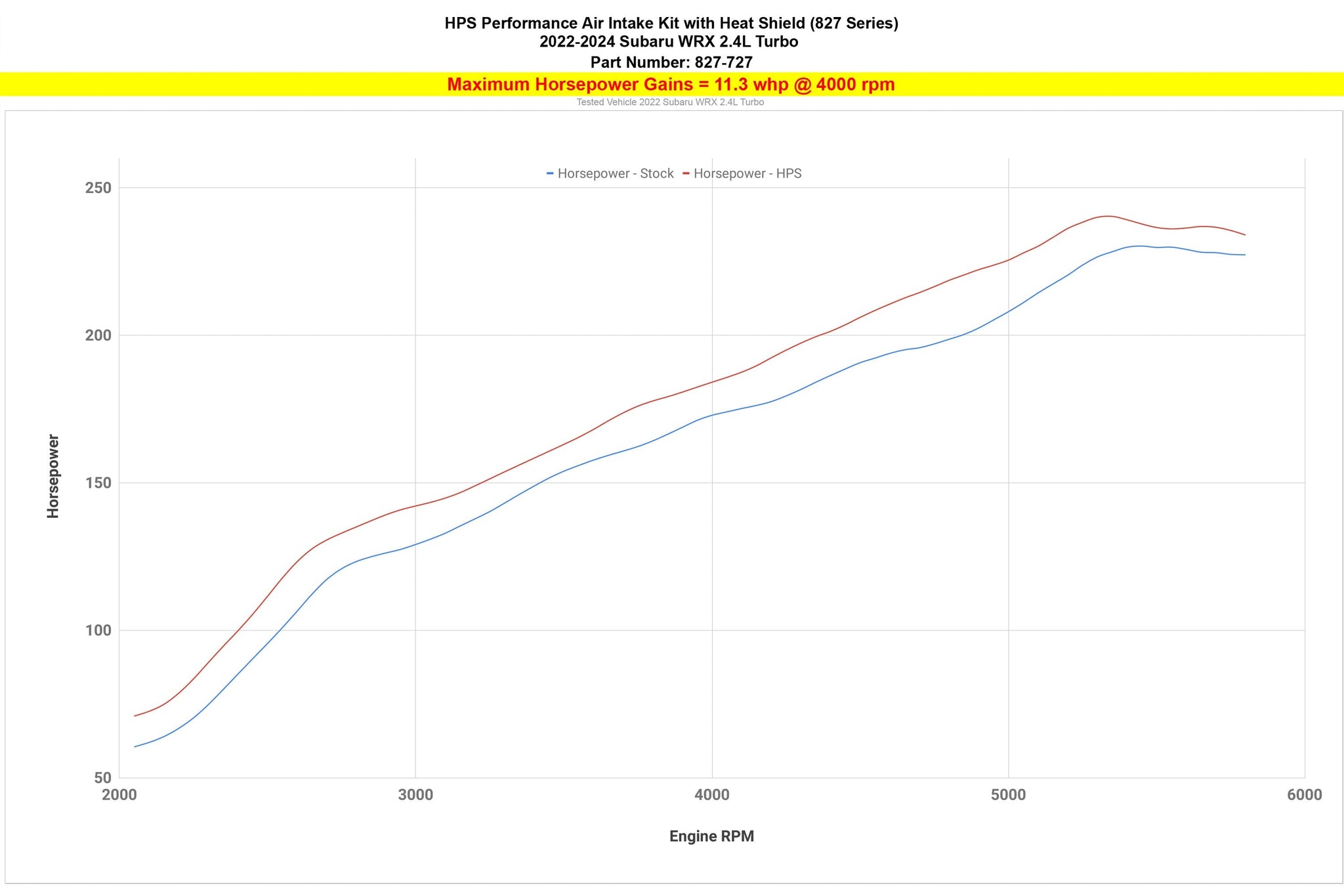 Unearth the thrill of enhanced throttle performance and acceleration of your Subaru WRX 2.4L Turbo with the HPS Performance Air Intake Kit. This HPS Performance air intake kit (Part number 827-727) is meticulously designed, targeting the limitations found in the stock intake system to optimize airflow, resulting in a substantial increase in overall power. Enjoy dyno proven gains of up to 11.3 horsepower and 14.8 lb-ft. of torque. This kit features a performance engineered 3” mandrel-bent aluminum intake tube, an enclosed powder coated steel heat shield, a 3-ply reinforced silicone coupler, and 100% stainless steel embossed hose clamps, ensuring reliable performance even under the toughest conditions. The kit also includes a washable and reusable cotton cone filter, promoting unrestricted airflow and an extended filter life. This easy-to-install kit is an essential upgrade for your WRX, promising to elevate your driving experience and enhance performance for a more exhilarating time behind the wheel.
