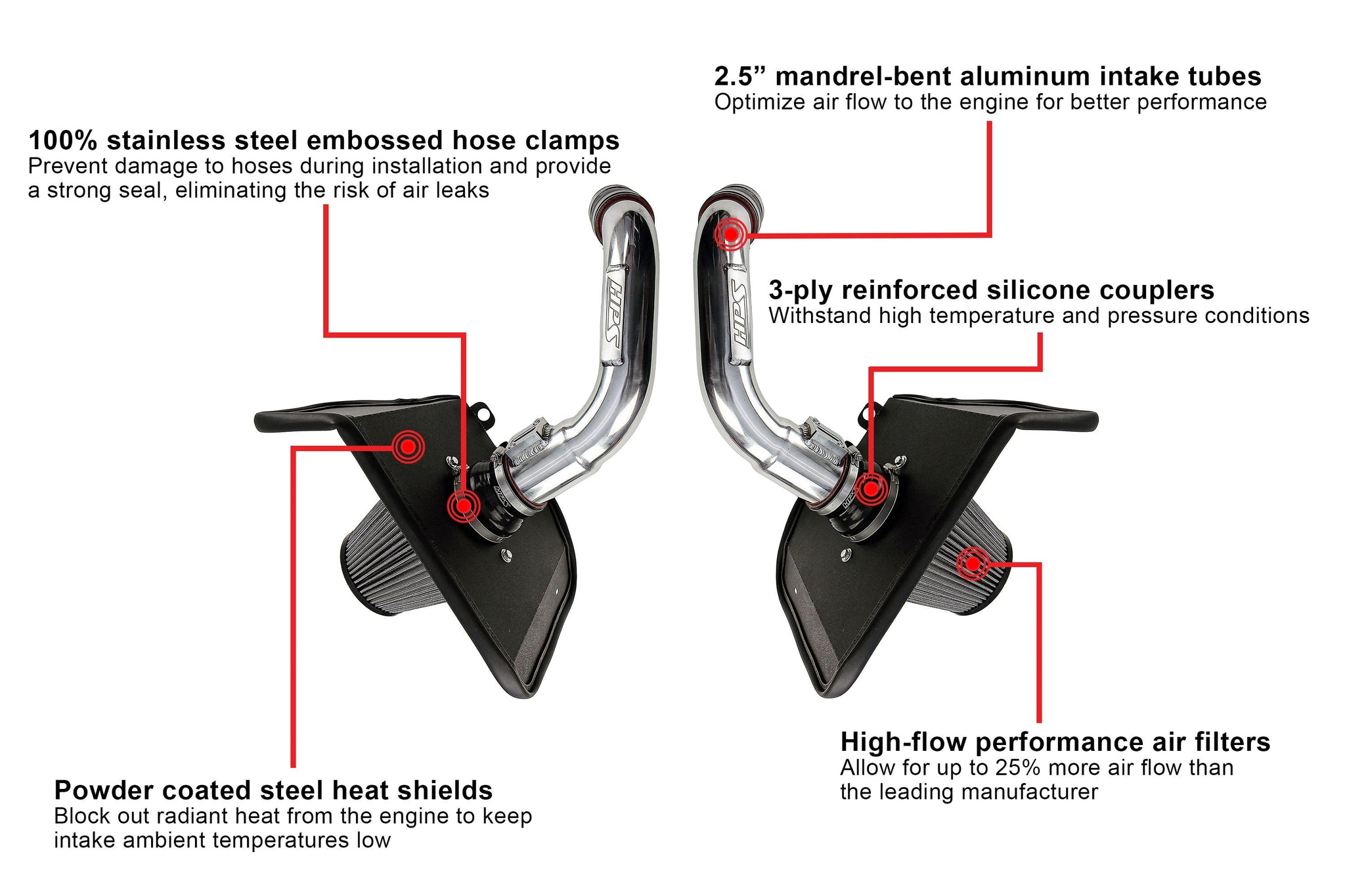 - Dual 2.5" mandrel-bent aluminum tubings replace stock restrictive air box and optimize the airflow with excellent heat dissipation and long-lasting durability.