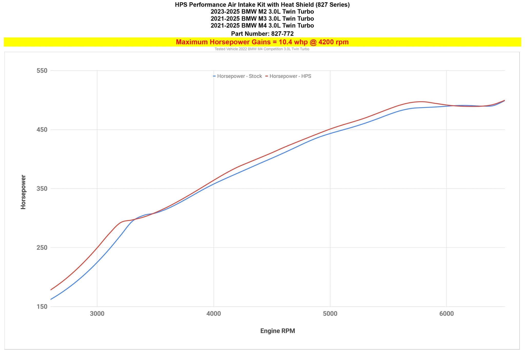 Designed with style and performance in mind, this HPS Performance Red Air Intake Kit with Heat Shield (part number 827-772R) is engineered to unleash the true potential of your M2 G87 S58 engine, delivering performance gains of up to 10.4 horsepower and 12.9 lb-ft. of torque. Our upgrade delivers razor-sharp throttle response and eliminates that last hint of turbo lag for a truly savage power delivery, transforming your daily commute into an exhilarating ride. Beyond the performance gains, this kit is built to last, featuring a smooth, 3" mandrel-bent aluminum intake pipe, custom molded silicone air intake hose, washable and reusable high-flow cotton air filters, durable reinforced silicone couplers, and robust stainless steel embossed hose clamps. The heavy duty powder coated steel heat shields integrate with the stock air scoops to direct cold air to the air filter. Designed for a straightforward bolt-on installation, this intake system requires no additional tuning or modifications, making it the perfect upgrade for you to elevate your BMW M2 G87 performance.