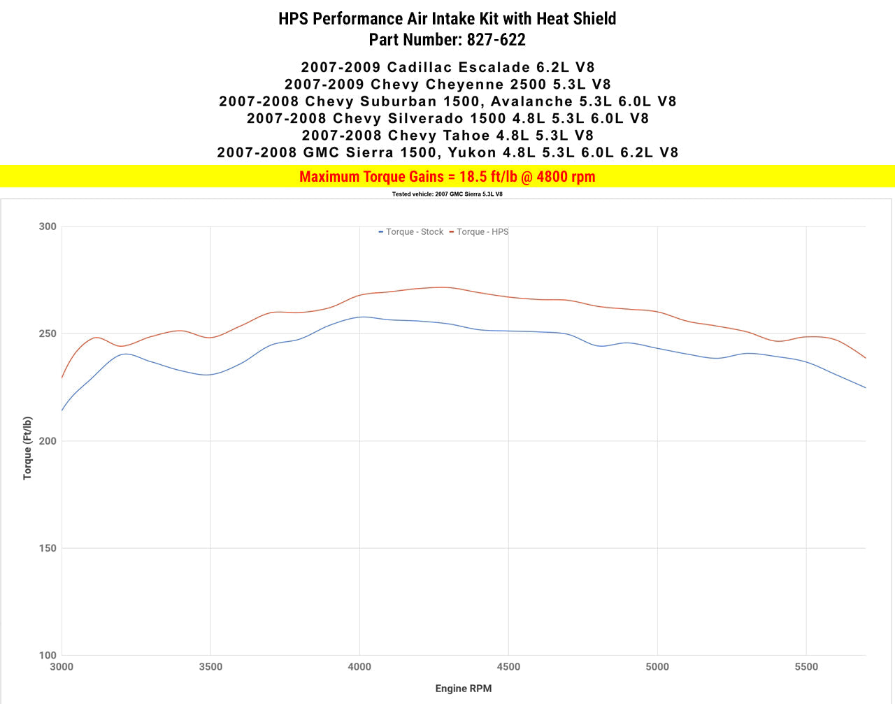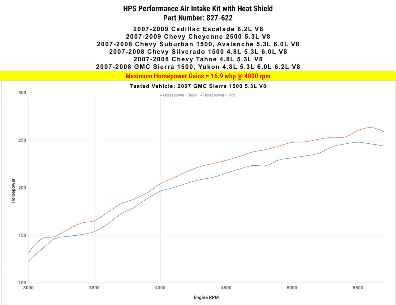 HPS Performance 827 Series air intake kit (Part # 827-622) for 2007-2009 Chevy Cheyenne 2500 5.3L V8 offers a free-flowing 4 inch mandrel-bent aluminum tube induction system designed to produce dyno proven performance gains - increase horsepower +16.9 whp , torque +18.5 ft/lbs and improve throttle response while maintaining safe air fuel ratio. The heavy duty powder coated steel heat shield blocks hot air from the air filter for the best cooling effect. The included installation manual has clear pictures and instructions to guide the installer throughout the whole process. The kit does NOT require tuning and does not trigger CEL light. No modification is required during the installation. HPS light weight mandrel-bent aluminum alloy tube replaces the stock restrictive air box and optimizes the airflow with excellent heat dissipation and long lasting durability. HPS Performance 827 Series shortram cold air intake kit features race proven reinforced silicone hoses and industrial grade 100% stainless steel t-bolt clamps which ensures reliability, even during the most extreme driving conditions. Proudly made in the United States, the All-New HPS Performance Air Filter is designed with performance in mind, delivering excellent filtration without sacrificing airflow.