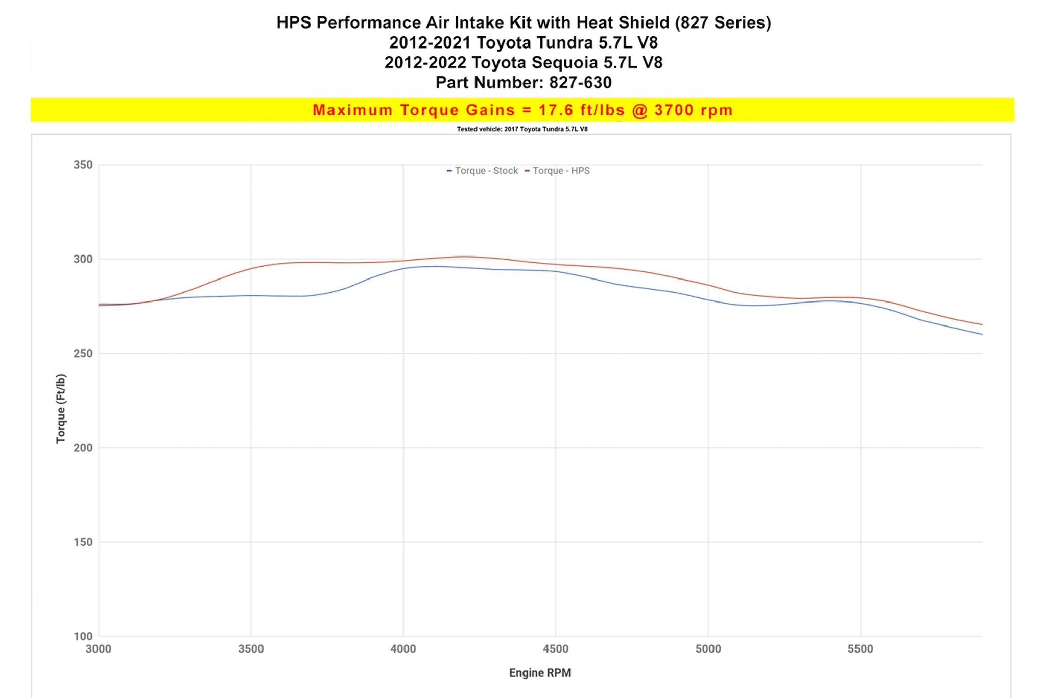 HPS Performance 827 Series air intake kit (Part # 827-630) for 2012-2019 Toyota Tundra 5.7L V8 offers a free-flowing 4 inch mandrel-bent aluminum tube induction system designed to produce dyno proven performance gains - increase horsepower +12.4 whp , torque +17.6 ft/lbs and improve throttle response while maintaining safe air fuel ratio. The heavy duty powder coated steel heat shield blocks hot air from the air filter for the best cooling effect. The included installation manual has clear pictures and instructions to guide the installer throughout the whole process. The kit does NOT require tuning and does not trigger CEL light. No modification is required during the installation. HPS light weight mandrel-bent aluminum alloy tube replaces the stock restrictive air box and optimizes the airflow with excellent heat dissipation and long lasting durability. HPS Performance 827 Series shortram cold air intake kit features race proven reinforced silicone hoses and industrial grade 100% stainless steel t-bolt clamps which ensures reliability, even during the most extreme driving conditions. Proudly made in the United States, the All-New HPS Performance Air Filter is designed with performance in mind, delivering excellent filtration without sacrificing airflow.