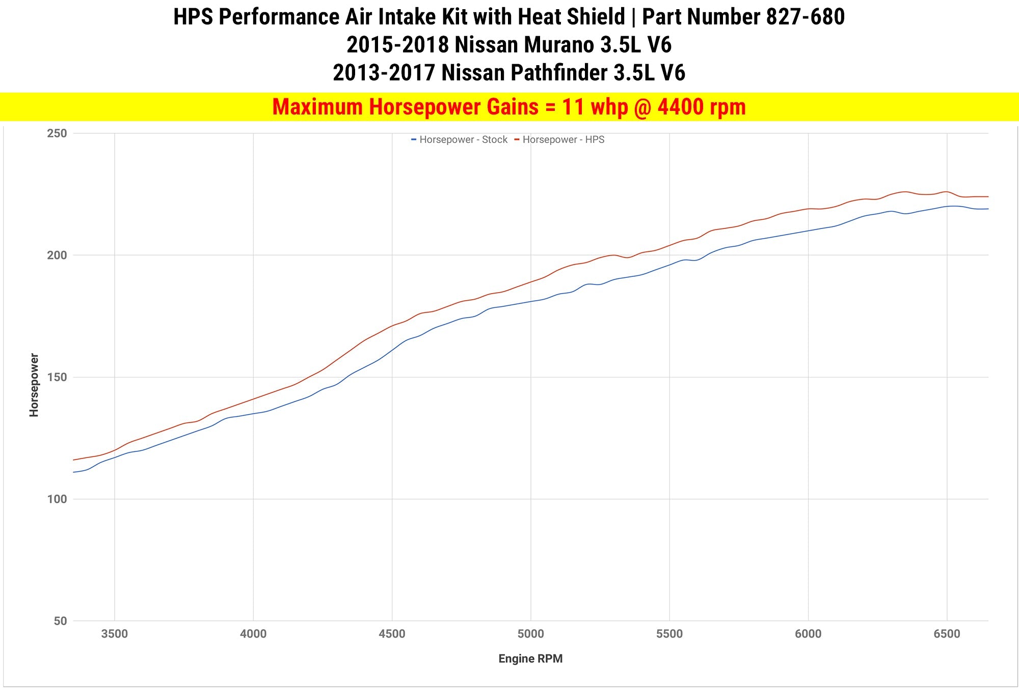 HPS Performance 827 Series air intake kit (Part # 827-680) for 2013-2016 Nissan Pathfinder 3.5L V6 offers a free-flowing 3 inch mandrel-bent aluminum tube induction system designed to produce dyno proven performance gains - increase horsepower +11 whp , torque +13 ft/lbs and improve throttle response while maintaining safe air fuel ratio. The included heat shield blocks hot air from the air filter for the best cooling effect. The included installation manual has clear pictures and instructions to guide the installer throughout the whole process. The kit does NOT require tuning and does not trigger CEL light. No modification is required during the installation. HPS light weight mandrel-bent aluminum alloy tube replaces the stock restrictive air box and optimizes the airflow with excellent heat dissipation and long lasting durability. HPS Performance 827 Series shortram cold air intake kit features race proven reinforced silicone hoses and industrial grade 100% stainless steel t-bolt clamps which ensures reliability, even during the most extreme driving conditions. Proudly made in the United States, the All-New HPS Performance Air Filter is designed with performance in mind, delivering excellent filtration without sacrificing airflow.