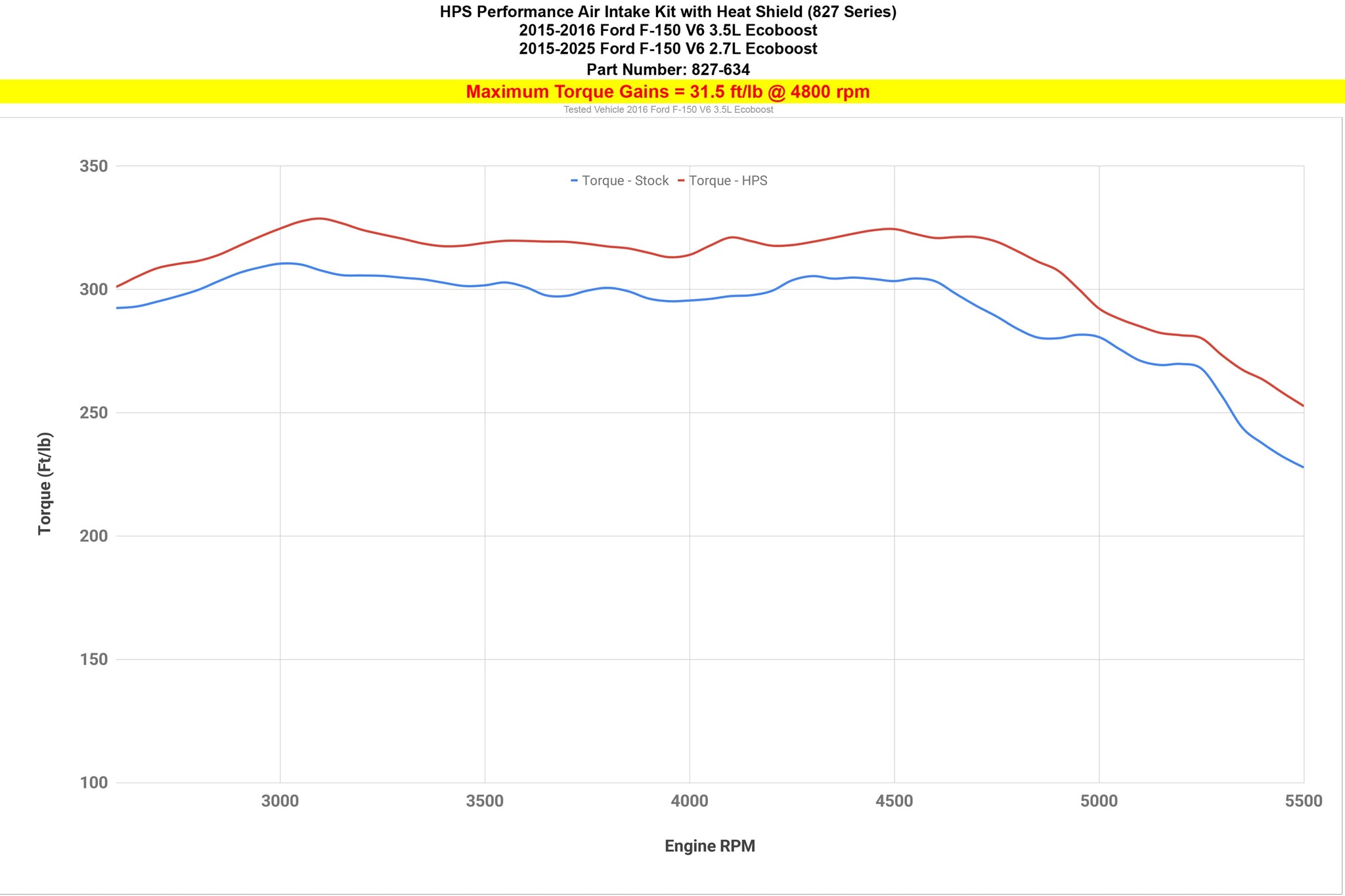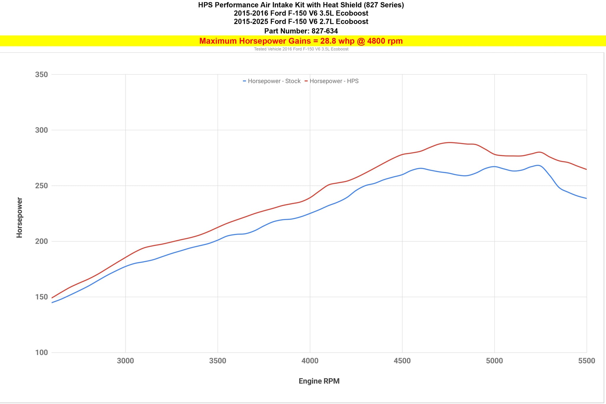 HPS Performance 827 Series air intake kit with heat shield (Part # 827-634) for 2015-2025 Ford F150 2.7L Ecoboost Turbo offers a free-flowing 3-1/2 inch mandrel-bent aluminum tube induction system designed to produce dyno proven performance gains - increase horsepower +28.8 whp , torque +31.5 ft/lbs and improve throttle response while maintaining safe air fuel ratio. The heavy duty powder coated steel heat shield blocks hot air from the air filter for the best cooling effect. The included installation manual has clear pictures and instructions to guide the installer throughout the whole process. The kit does NOT require tuning and does not trigger CEL light. No modification is required during the installation. HPS light weight mandrel-bent aluminum alloy tube replaces the stock restrictive air box and optimizes the airflow with excellent heat dissipation and long lasting durability. HPS Performance 827 Series shortram cold air intake kit features race proven reinforced silicone hoses and industrial grade 100% stainless steel t-bolt clamps which ensures reliability, even during the most extreme driving conditions. Proudly made in the United States, the All-New HPS Performance Air Filter is designed with performance in mind, delivering excellent filtration without sacrificing airflow.