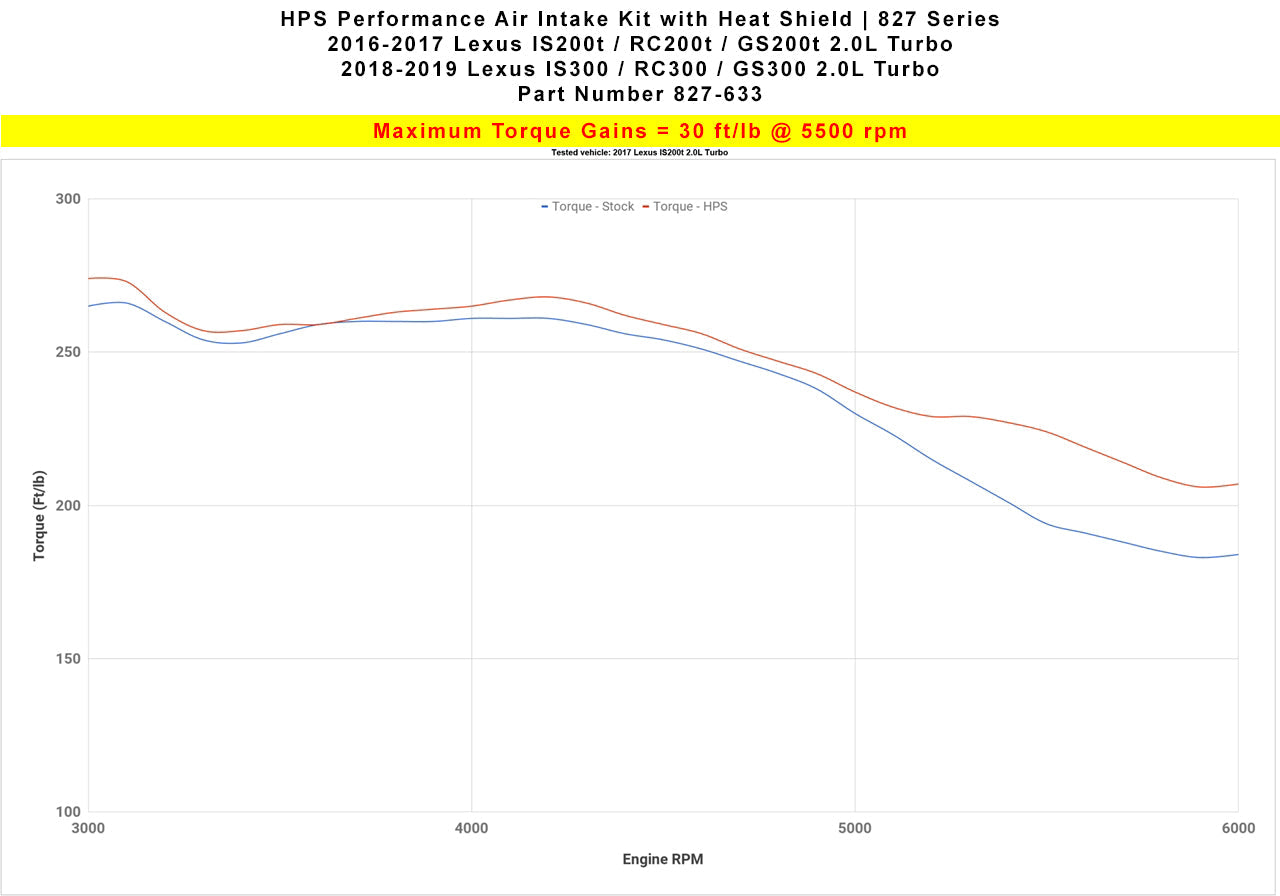 HPS Performance 827 Series air intake kit (Part # 827-633) for 2016-2017 Lexus GS200t 2.0L Turbo offers a free-flowing 3 inch mandrel-bent aluminum tube induction system designed to produce dyno proven performance gains - increase horsepower +31 whp , torque +30 ft/lbs and improve throttle response while maintaining safe air fuel ratio. The heavy duty powder coated steel heat shield integrates with the factory fresh air scoop to direct cold air to the air filter for the best cooling effect. The included installation manual has clear pictures and instructions to guide the installer throughout the whole process. The kit does NOT require tuning and does not trigger CEL light. No modification is required during the installation. HPS light weight mandrel-bent aluminum alloy tube replaces the stock restrictive air box and optimizes the airflow with excellent heat dissipation and long lasting durability. HPS Performance 827 Series shortram cold air intake kit features race proven reinforced silicone hoses and industrial grade 100% stainless steel t-bolt clamps which ensures reliability, even during the most extreme driving conditions. Proudly made in the United States, the All-New HPS Performance Air Filter is designed with performance in mind, delivering excellent filtration without sacrificing airflow.