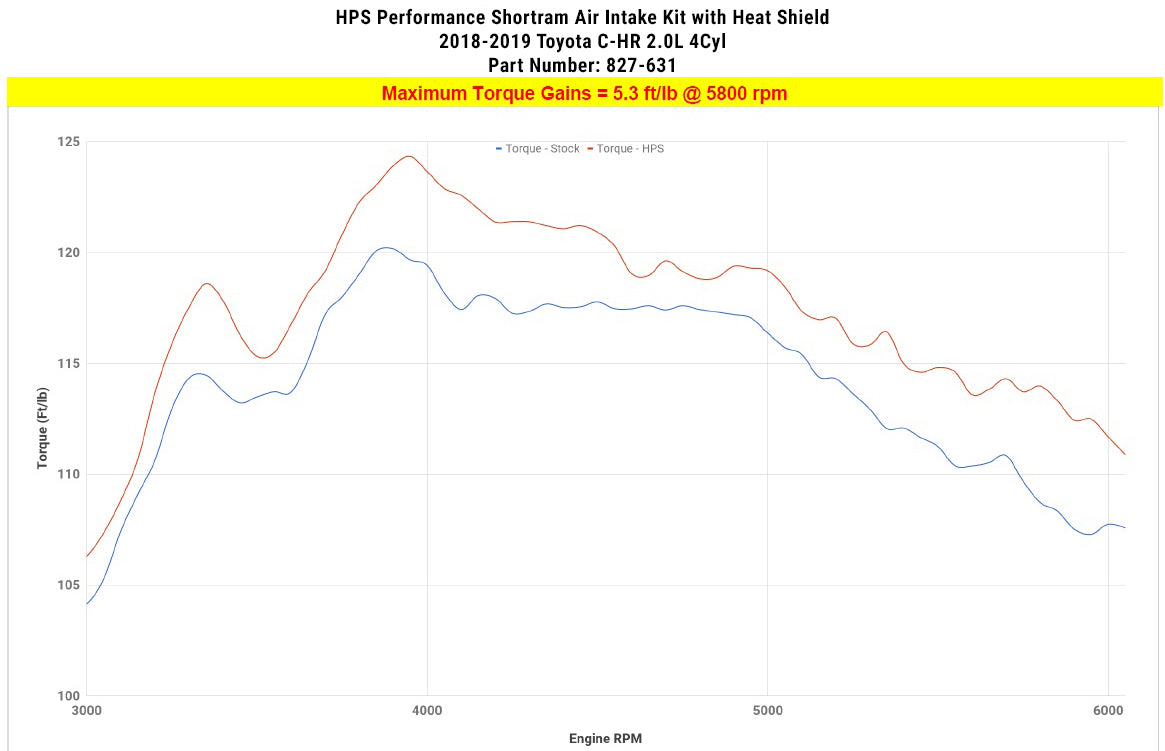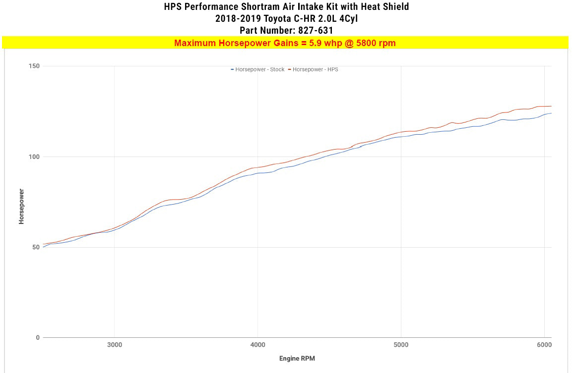 HPS Performance 827 Series air intake kit (Part # 827-631) for 2018-2019 Toyota C-HR 2.0L offers a free-flowing 2-1/2 inch mandrel-bent aluminum tube induction system designed to produce dyno proven performance gains - increase horsepower +5.9 whp , torque +5.3 ft/lbs and improve throttle response while maintaining safe air fuel ratio. The heavy duty powder coated steel heat shield integrates with the factory fresh air scoop to direct cold air to the air filter for the best cooling effect. The included installation manual has clear pictures and instructions to guide the installer throughout the whole process. The kit does NOT require tuning and does not trigger CEL light. No modification is required during the installation. HPS light weight mandrel-bent aluminum alloy tube replaces the stock restrictive air box and optimizes the airflow with excellent heat dissipation and long lasting durability. HPS Performance 827 Series shortram cold air intake kit features race proven reinforced silicone hoses and industrial grade 100% stainless steel t-bolt clamps which ensures reliability, even during the most extreme driving conditions. Proudly made in the United States, the All-New HPS Performance Air Filter is designed with performance in mind, delivering excellent filtration without sacrificing airflow.
