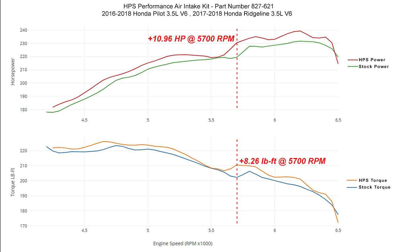 HPS Performance 827 Series Air Intake Kit with Heat Shield (part number 827-621) for 2019-2025 Honda Passport 3.5L V6 offers a free-flowing 3-1/2 inch mandrel-bent aluminum tube induction system designed to produce dyno proven performance gains - increase horsepower +11 whp , torque +8.3 ft/lbs and improve throttle response while maintaining safe air fuel ratio. The heavy duty powder coated steel heat shield blocks hot air from the air filter for the best cooling effect. The included installation manual has clear pictures and instructions to guide the installer throughout the whole process. The kit does NOT require tuning and does not trigger CEL light. No modification is required during the installation. HPS light weight mandrel-bent aluminum alloy tube replaces the stock restrictive air box and optimize the air flow with excellent heat dissipation and long lasting durability. HPS Performance 827 Series air intake kit features race proven reinforced silicone hoses and industrial grade 100% stainless steel T-bolt clamps which ensures reliability, even during the most extreme driving conditions. The All-New HPS Performance Air Filter is designed with performance in mind, delivering excellent filtration without sacrificing air flow. All HPS Performance Air Filter are made in the United States.
