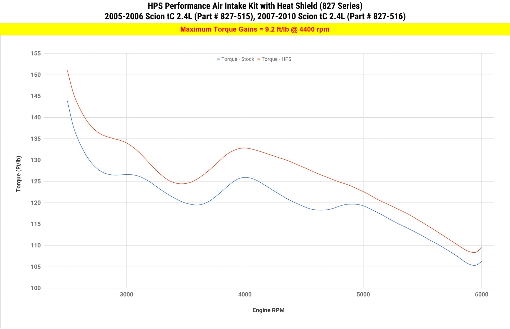 The All-New HPS Performance 827 Series Air Intake Kit (Part # 827-516) for 2007-2010 Scion tC 2.4L offers a free-flowing 3 inch mandrel-bent aluminum tube induction system designed to produce dyno proven performance gains - increase horsepower +7.9 whp , torque +9.2 ft/lbs and improve throttle response while maintaining safe air fuel ratio. The heavy duty powder coated steel heat shield blocks hot air from the air filter for the best cooling effect. The included installation manual has clear pictures and instructions to guide the installer throughout the whole process. The kit does NOT require tuning and does not trigger CEL light. No modification is required during the installation. HPS light weight mandrel-bent aluminum alloy tube replaces the stock restrictive air box and optimizes the airflow with excellent heat dissipation and long lasting durability. HPS Performance 827 Series air intake kit features race proven reinforced silicone hoses and industrial grade 100% stainless steel T-bolt clamps which ensures reliability, even during the most extreme driving conditions. The All-New HPS Performance Air Filter is designed with performance in mind, delivering excellent filtration without sacrificing airflow. All HPS Performance Air Filters are made in the United States.