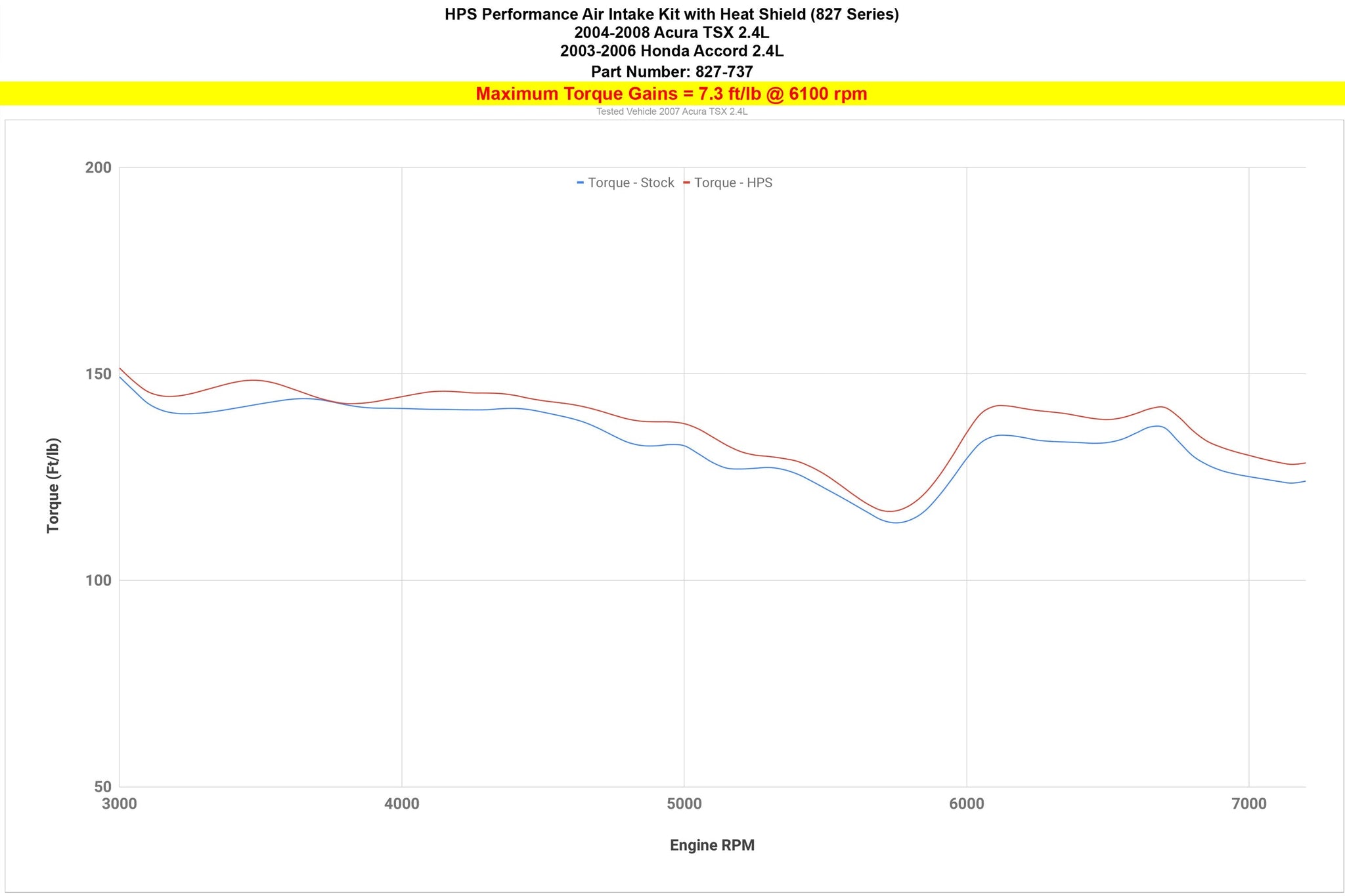 Designed with performance in mind, this All-New HPS Performance Air Intake Kit with Heat Shield (part number 827-737) replaces your 7th Gen Honda Accord 2.4L without MAF sensor restrictive stock intake tubing and air cleaner with a custom made 2.75" mandrel-bent aluminum intake tube. A reusable high-flow cotton air filter is incorporated in the design to deliver maximum power gains. The specially designed heat shield prevents radiant heat from entering the engine while at the same time allowing the enhanced induction sound to be heard upon acceleration. HPS air intake kits feature high performance hardware such as durable HPS 3-ply silicone couplers and stainless steel T-bolt clamps that are engineered to perform under toughest driving conditions. Experience faster 0-60 times with dyno proven gains of up to 8.6 horsepower and 7.3 lb-ft of torque.