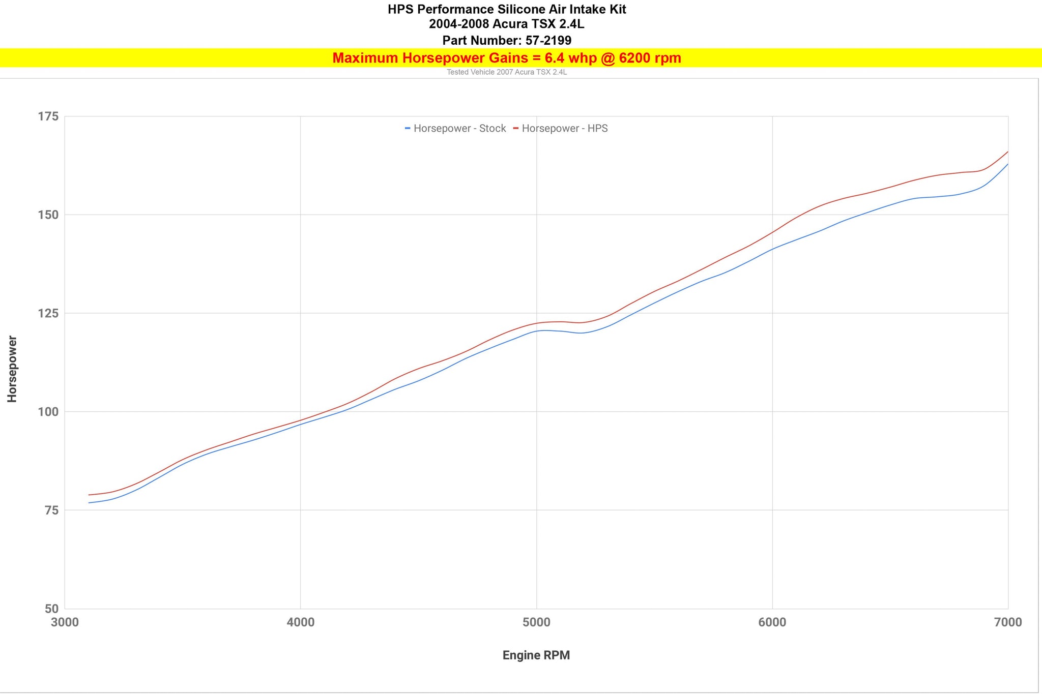 HPS high temperature 4-ply reinforced silicone air intake hose kit (part number 57-2199) is the ideal replacement upgrade from the restrictive stock OEM rubber air intake hose. Engineered with high-heat resistant material, the intake hose can easily withstand temperatures of up to 350 degrees Fahrenheit. Without requiring any retuning, this HPS silicone air intake kit improves throttle response by delivering smoother, unrestricted air flow to the engine while preventing heat soak that raises intake air temperatures and reduces overall power output. This kit delivers an additional 6.4 horsepower and 5.4 lb-ft. of torque. It retains use of the stock air filter housing which minimizes the number of parts to change, keeping the installation simple. This replacement upgrade includes HPS 100% stainless steel embossed hose clamps that are fit for even the harshest road conditions. No additional modifications or tuning are required to install this kit.