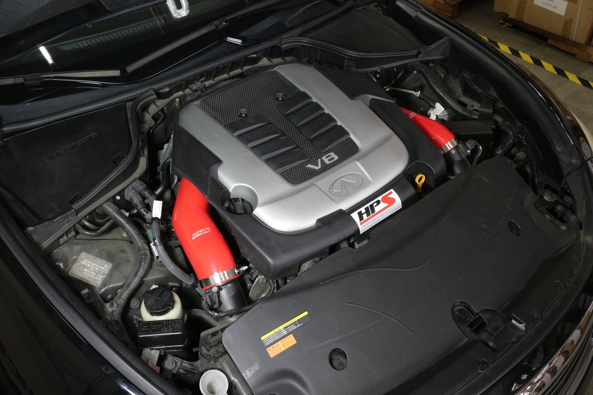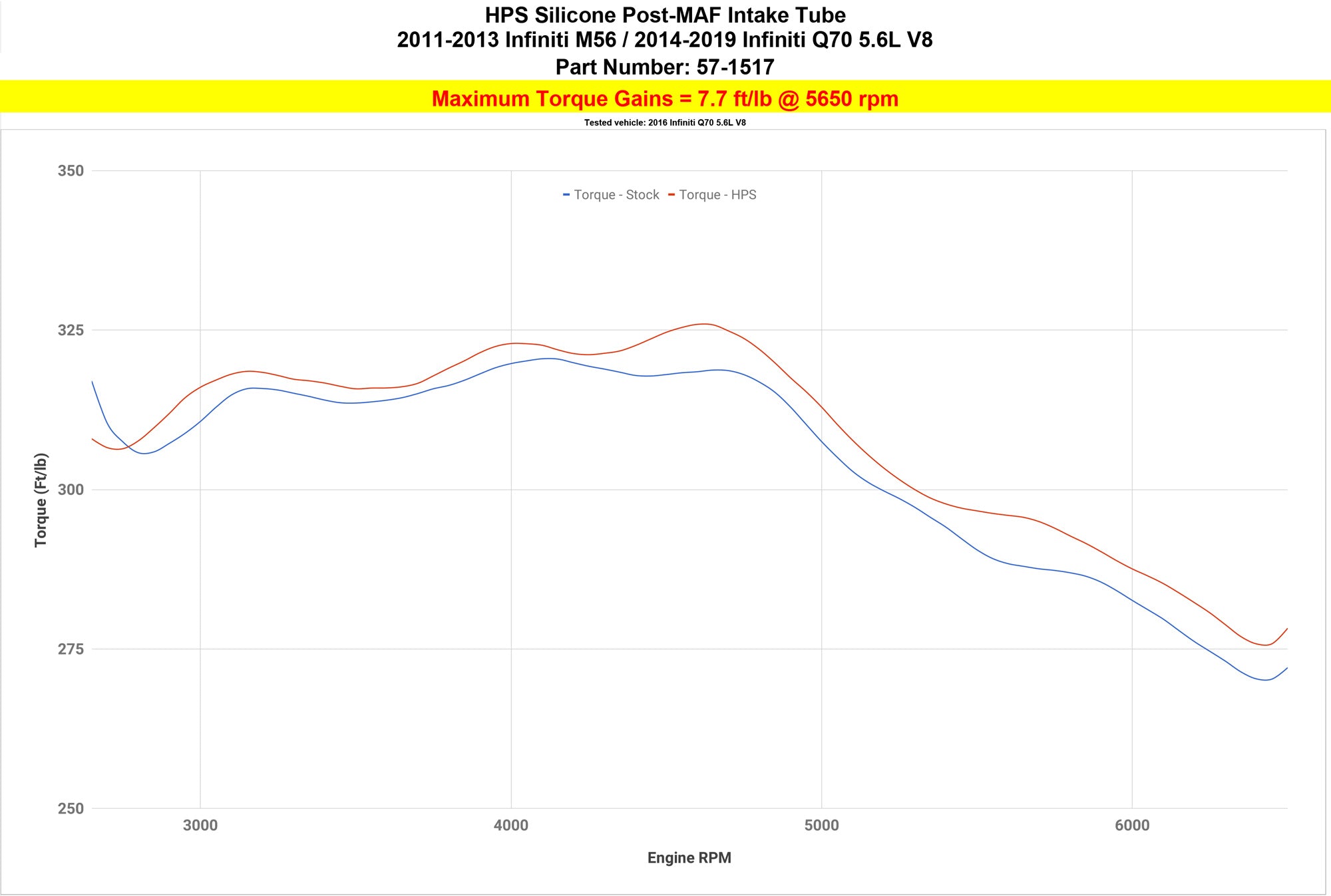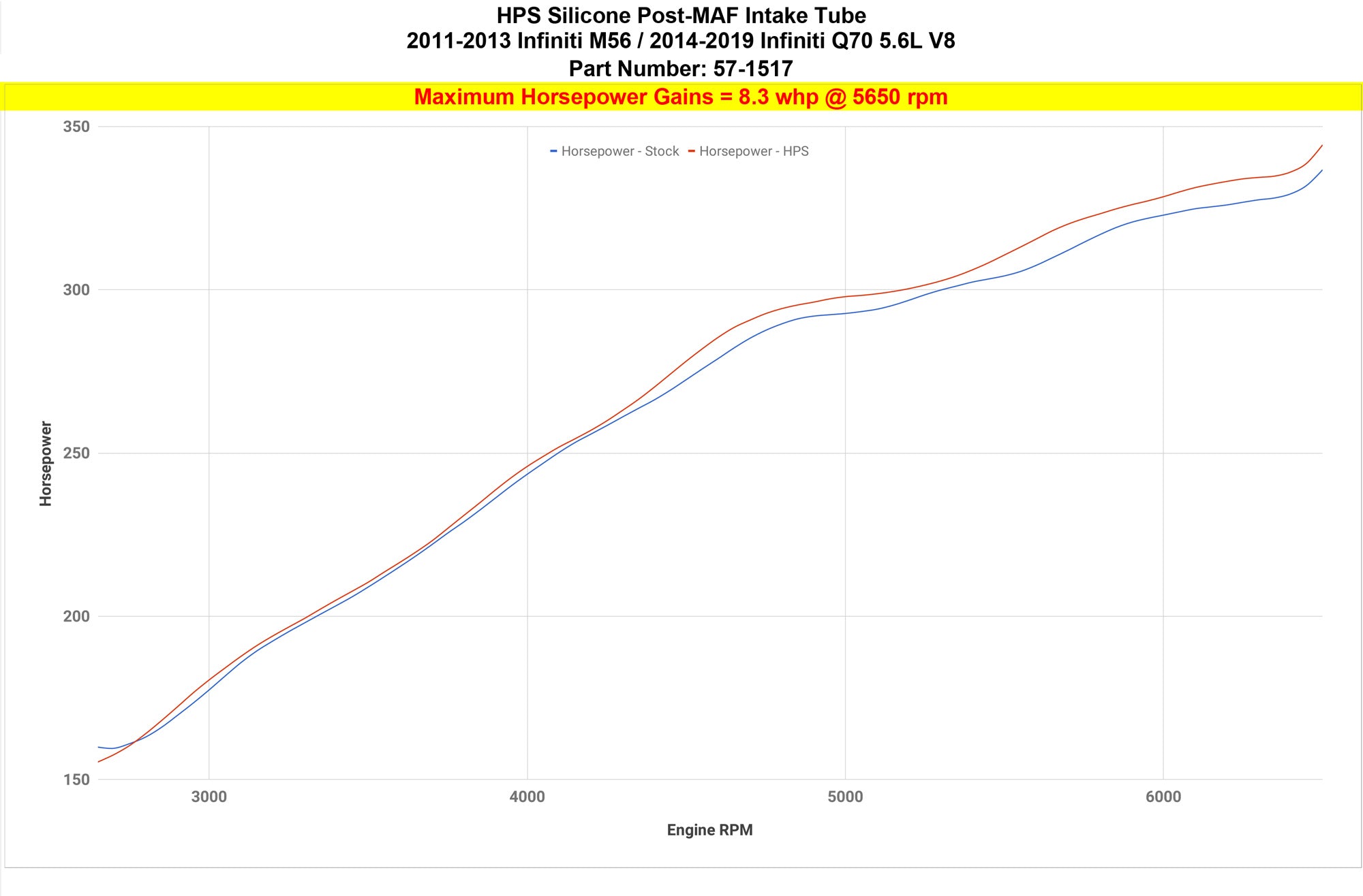 HPS Performance Reinforced Silicone Post MAF Air Intake Tubes (Part # 57-1517) replaces the stock OEM restrictive rubber intake hoses on Infiniti 14-19 Q70 5.6L V8. This HPS post MAF silicone intake hose kit improves air flow and reduces heat soak while keeping the stock well designed air box perform at high efficient level. Without any re-tuning, the HPS silicone post MAF air intake Tube delivers dyno-proven performance gains of +8.3 Whp, +7.7 Ft/Lbs. This kit does NOT require tuning and does not trigger CEL light. No modification is required during the installation.