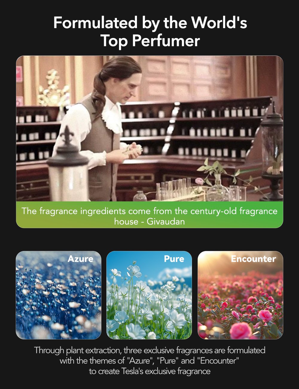 - [Selected Swiss Givaudan Fragrances]Â The fragrance raw materials come from Givaudan, a century-old fragrance house. Through plant extraction, three exclusive fragrances are formulated with the themes of "Blue", "Purity" and "Encounter" to create a poetic space inside the car for Tesla owners.