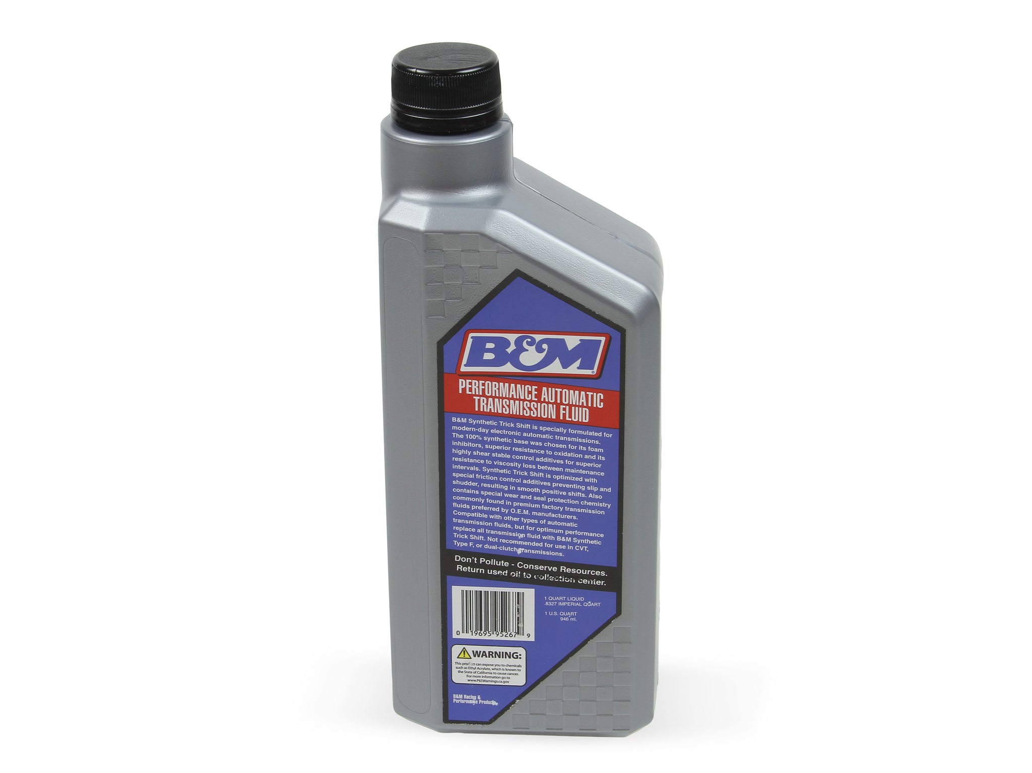Back by popular demand and with an improved formula, B&M Synthetic Trick Shift transmission fluid is specially formulated for modern-day electronic automatic transmissions. The 100% synthetic base was chosen for its foam inhibitors, superior resistance to oxidation, and its high shear stable control additives for superior resistance to viscosity loss between maintenance intervals. Synthetic Trick Shift is optimized with special friction control additives preventing slip and shudder, resulting in smooth positive shifts. Also contains special wear and seal protection chemistry commonly found in premium factory transmission fluids preferred by O.E.M. manufacturers. Compatible with other types of automatic transmission fluids but for optimum performance, it is recommended to drain and replace all transmission fluid with B&M Synthetic Trick Shift. Available separately in 1-quart bottles. Note: Not recommended for use in CVT, Type F, or dual-clutch transmissions.