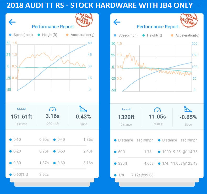 Monitor your 0-60mph, 1/4 mile, 60-130mph, 100-200kmh, 1/2 mile performance, & more!
