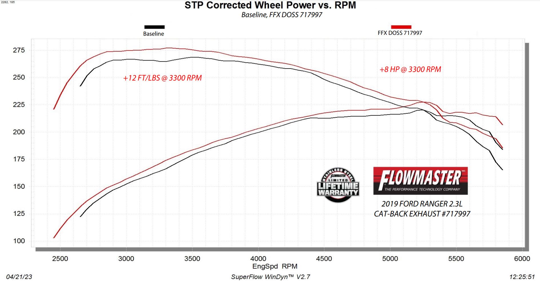 This Flowmaster® Flow FX® cat-back exhaust system for the 2019-2023 Ford Ranger with the 2.3-liter engine is manufactured using durable 409 stainless steel throughout and features 3.00 to dual 2.50-inch mandrel bent pipes for better exhaust gas flow. This system exits with dual 3.50-inch black stainless steel tips for added style and a custom look. Max gains of 8 hp and 12 lb-ft of torque at the rear wheels over stock. The system uses all the existing factory hanger locations and includes installation instructions and all necessary hardware for an easy installation that you can do at home. Backed by Flowmaster's Lifetime Limited Warranty.