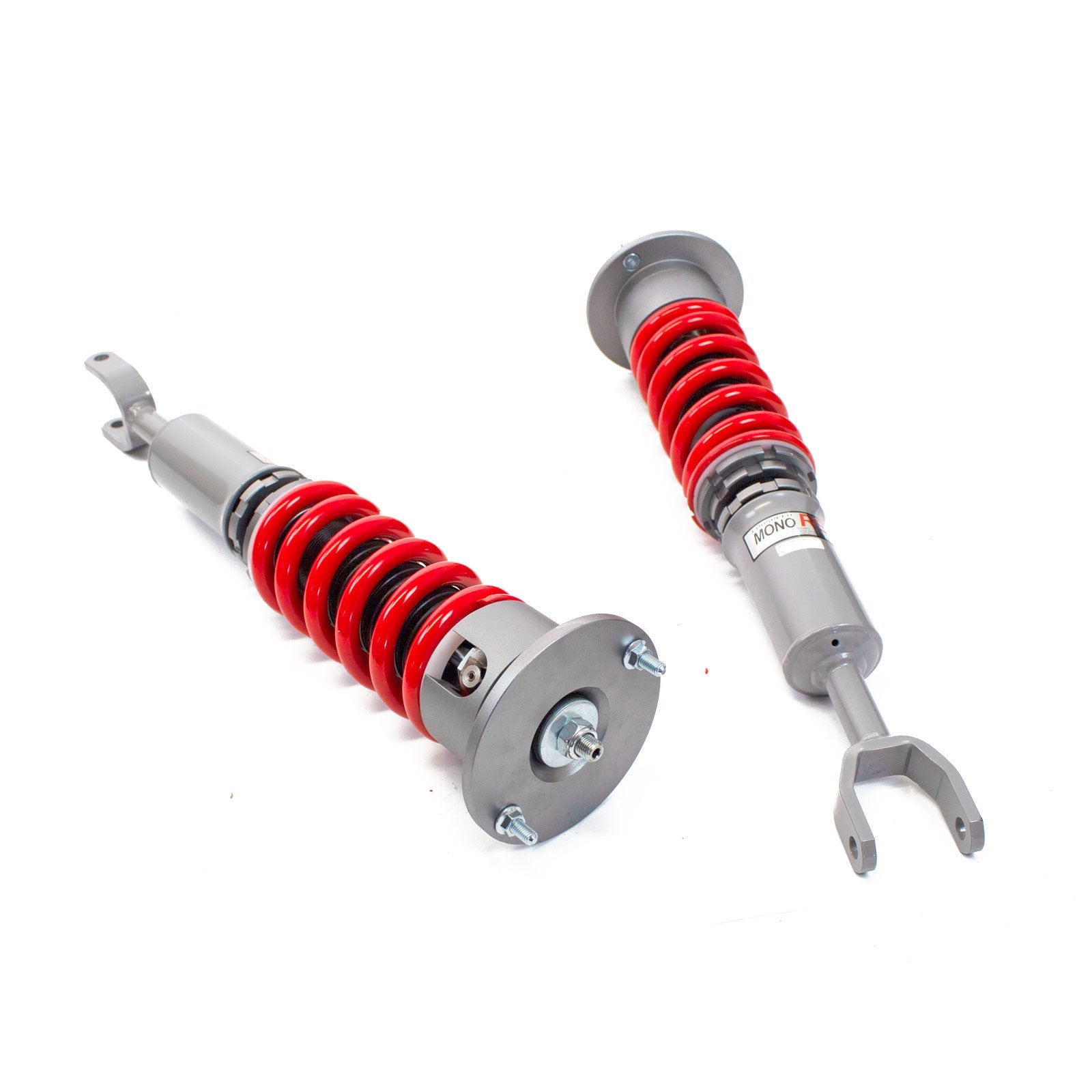 MonoRS Coilover damper kit by Godspeed Project are an intermediate suspension upgrade setup for daily and Sunday club racing. Lowering your car with improved springs over factory and paired with Monotube shocks with valving that allows 32 levels of rebound adjustment to improve handling without sacrifice comfort. Ride height can easily be adjusted by twisting the lower mount bracket. In order to keep weight gain at the minimum, most of attachments and accessories are CNC machined from billet aluminum. Koyo bearings are used when camber plate top mount is applicable depends on car models. To assure that our customers are getting high quality products, MonoRS coilovers are covered by 12 months limited warranty by the manufacturer from top to bottom just like other big brand name setups.