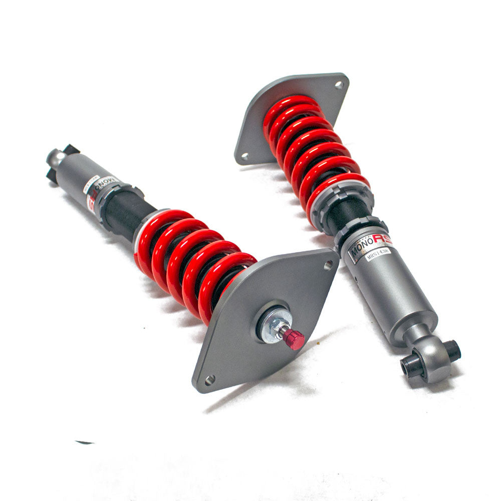 MonoRS Coilover damper kit by Godspeed Project are an intermediate suspension upgrade setup for daily and Sunday club racing. Lowering your car with improved springs over factory and paired with Monotube shocks with valving that allows 32 levels of rebound adjustment to improve handling without sacrifice comfort. Ride height can easily be adjusted by twisting the lower mount bracket. In order to keep weight gain at the minimum, most of attachments and accessories are CNC machined from billet aluminum. Koyo bearings are used when camber plate top mount is applicable depends on car models. To assure that our customers are getting high quality products, MonoRS coilovers are covered by 12 months limited warranty by the manufacturer from top to bottom just like other big brand name setups.