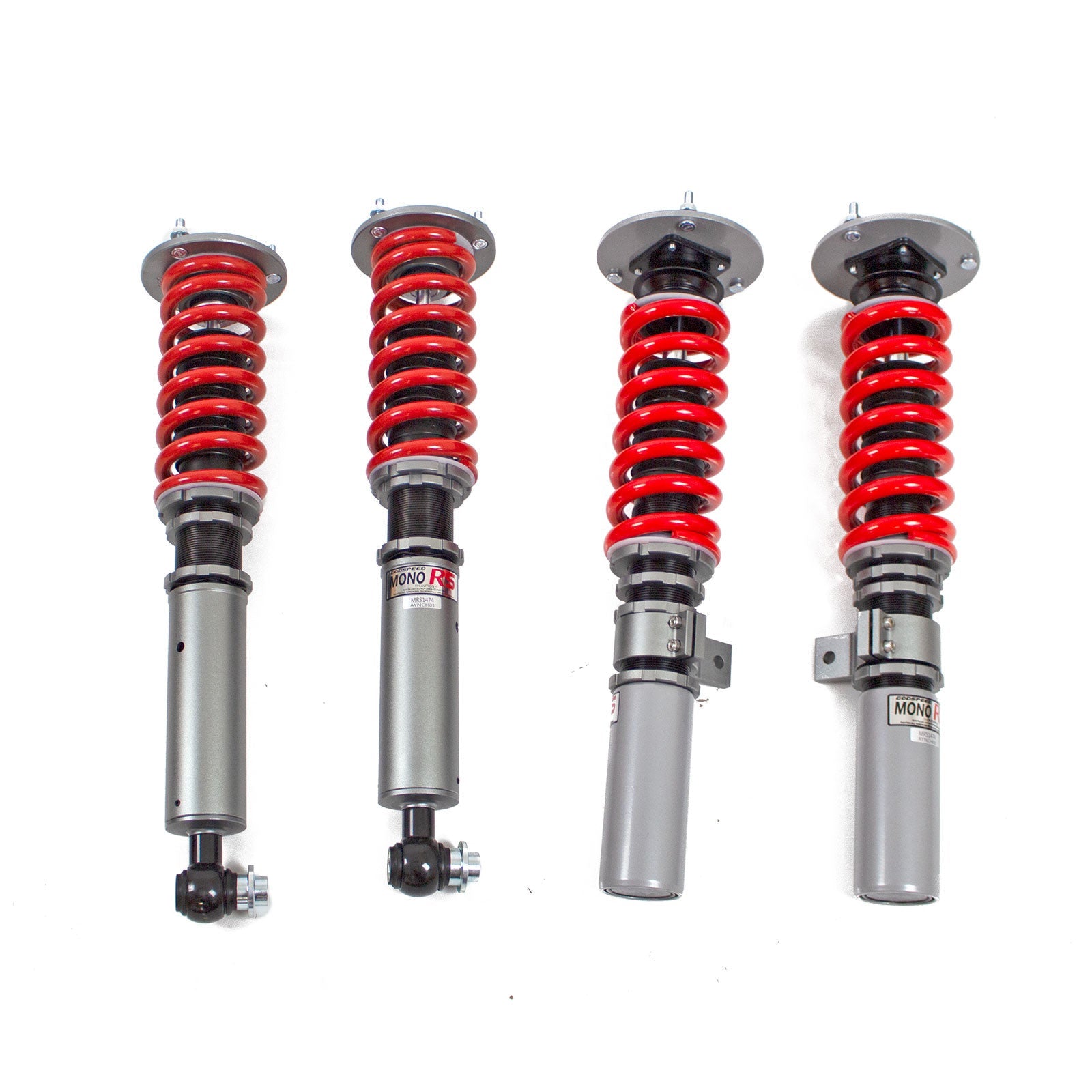MonoRS Coilover damper kit by Godspeed Project are an intermediate suspension upgrade setup for daily and Sunday club racing. Lowering your car with improved springs over factory and paired with Monotube shocks with valving that allows 32 levels of rebound adjustment to improve handling without sacrifice comfort. Ride height can easily be adjusted by twisting the lower mount bracket. In order to keep weight gain at the minimum, most of attachments and accessories are CNC machined from billet aluminum. Koyo bearings are used when camber plate top mount is applicable depends on car models. To assure that our customers are getting high quality products, MonoRS coilovers are covered by 12 months limited warranty by the manufacturer from top to bottom just like other big brand name setups.