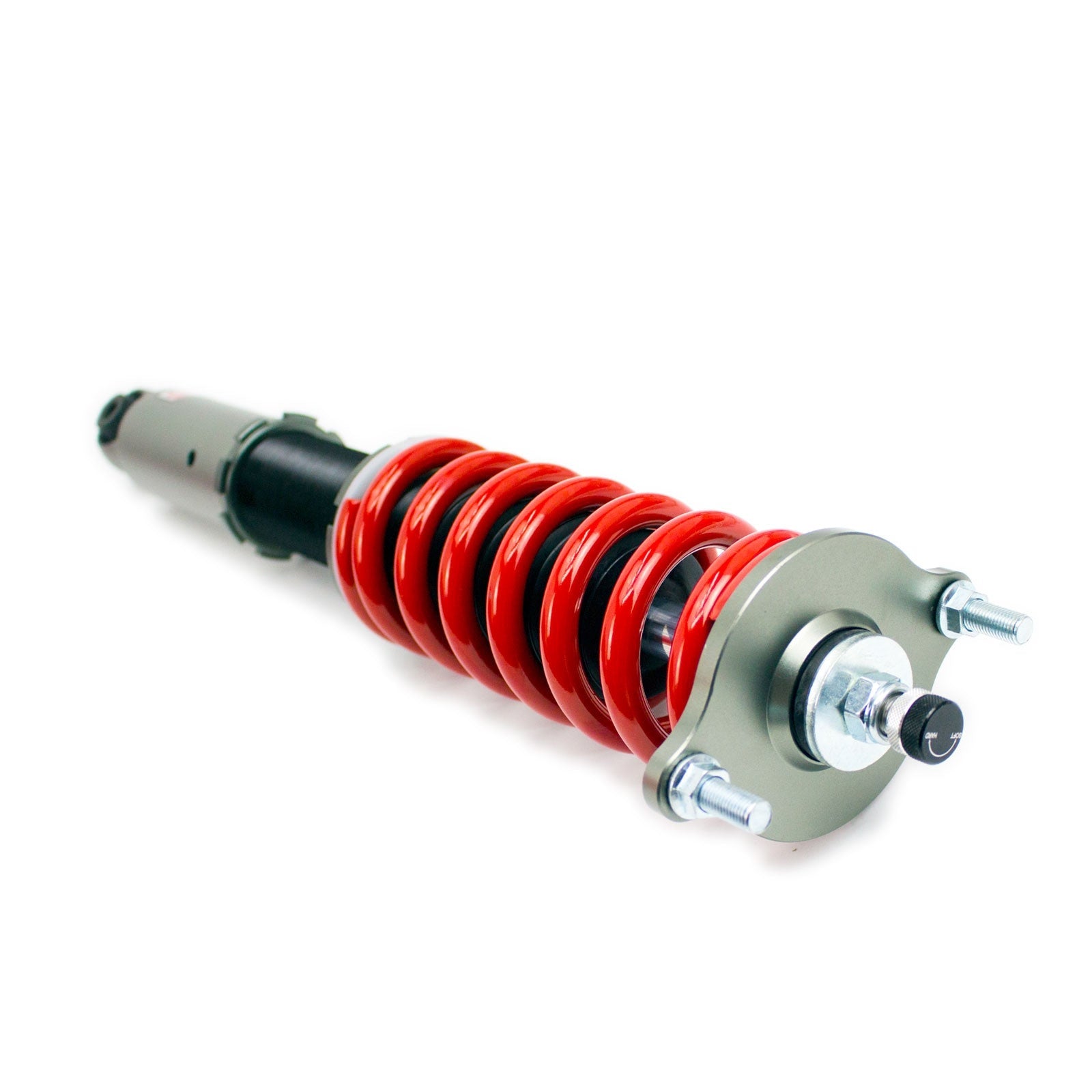MonoRS Coilover damper kit by Godspeed Project are an intermediate suspension upgrade setup for daily and Sunday club racing. Lowering your car with improved springs over factory and paired with Monotube shocks with valving that allows 32 levels of rebound adjustment to improve handling without sacrifice comfort. Ride height can easily be adjusted by twisting the lower mount bracket. In order to keep weight gain at the minimum, most of attachments and accessories are CNC machined from billet aluminum. Koyo bearings are used when camber plate top mount is applicable depends on car models. To assure that our customers are getting high quality products, MonoRS coilovers are covered by 12 months limited warranty by the manufacturer from top to bottom just like other big brand name setups.