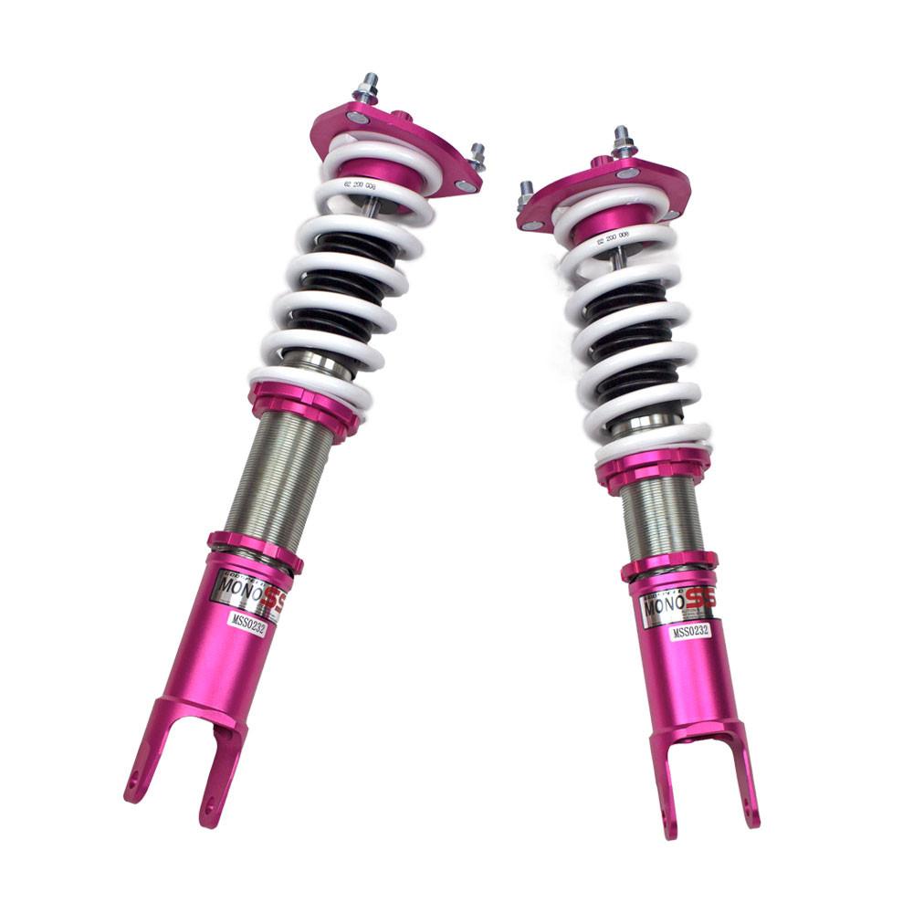 GodSpeed MonoSS coilovers are great entry level single adjustable coilovers. GodSpeed starts with a race coilover and tones it down for the street to give you an extremely capable coilover that you can comfortably use every day. GodSpeed uses some of the best and most exotic components on the market such as a carbon seamless steel 52mm tube with a high performance internal shock piston that provides fast and precise damper response. GodSpeed coilover springs are cold-bent from high strength SAE9252 steel to be comfortable and high performance.