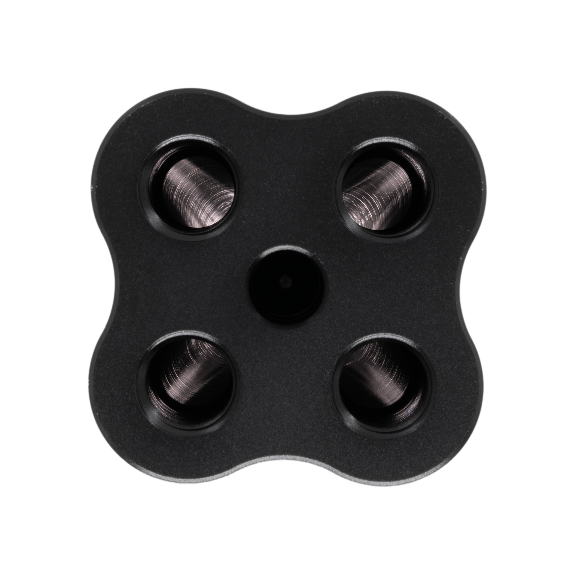 The 1 In 4 Out Shower Head Distribution Block features a single 3/8" NPT inlet and four 1/4" NPT outlets for optimal flow management. Machined from durable 6061 billet aluminum with a matte black anodized finish, it combines strength, style, and corrosion resistance. The engineered flow path ensures increased flow rate and uniform distribution across all outlets. Its compact design is perfect for efficient hose distribution in tight spaces, making it ideal for a variety of applications where both performance and space-saving are essential.