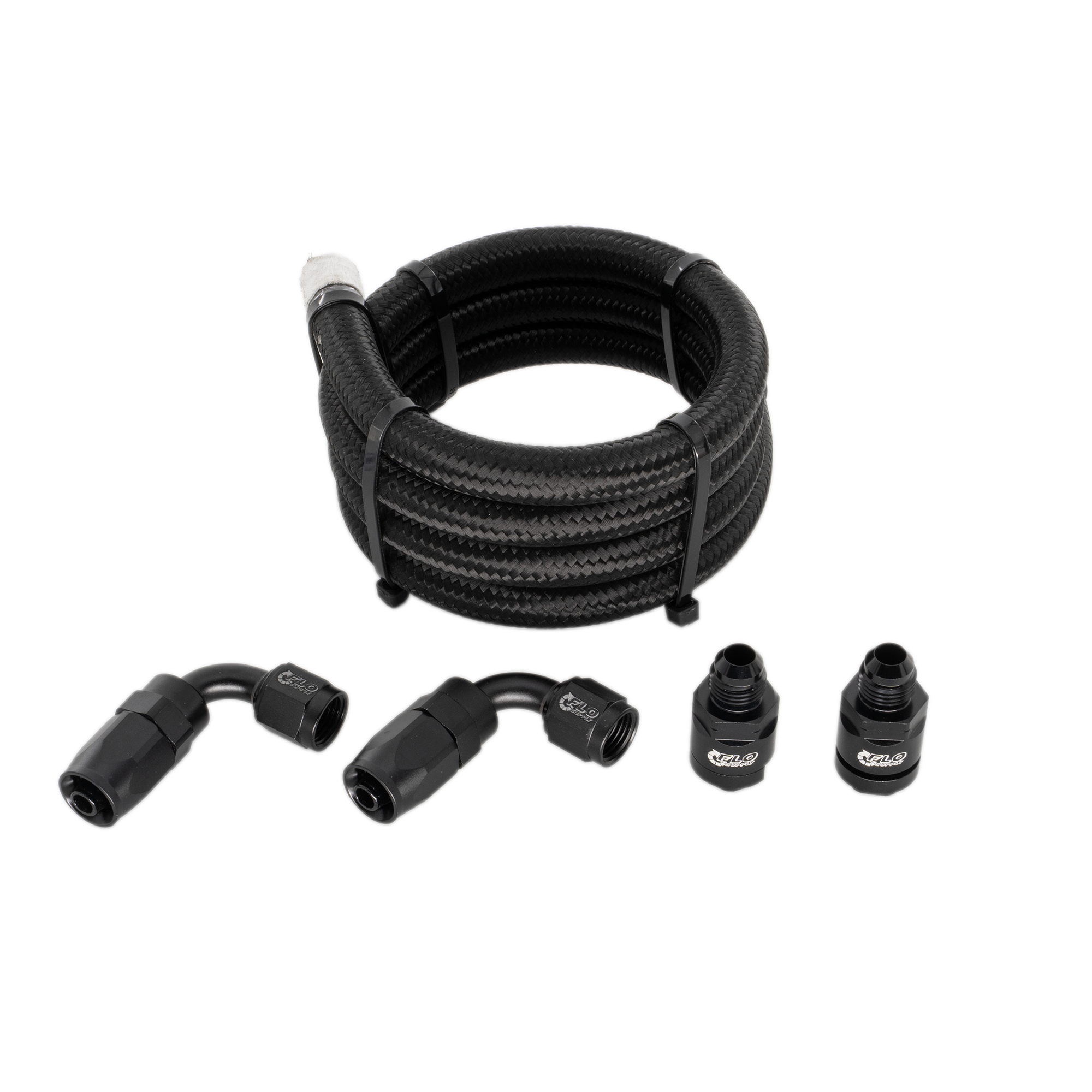Improved Fuel Flow. Includes four feet of E85 compatible high pressure hose, two aluminum black anodized 90° hose ends, two aluminum black anodized 6 AN x factory size quick disconnect adapters and four feet of split loom for a factory look.