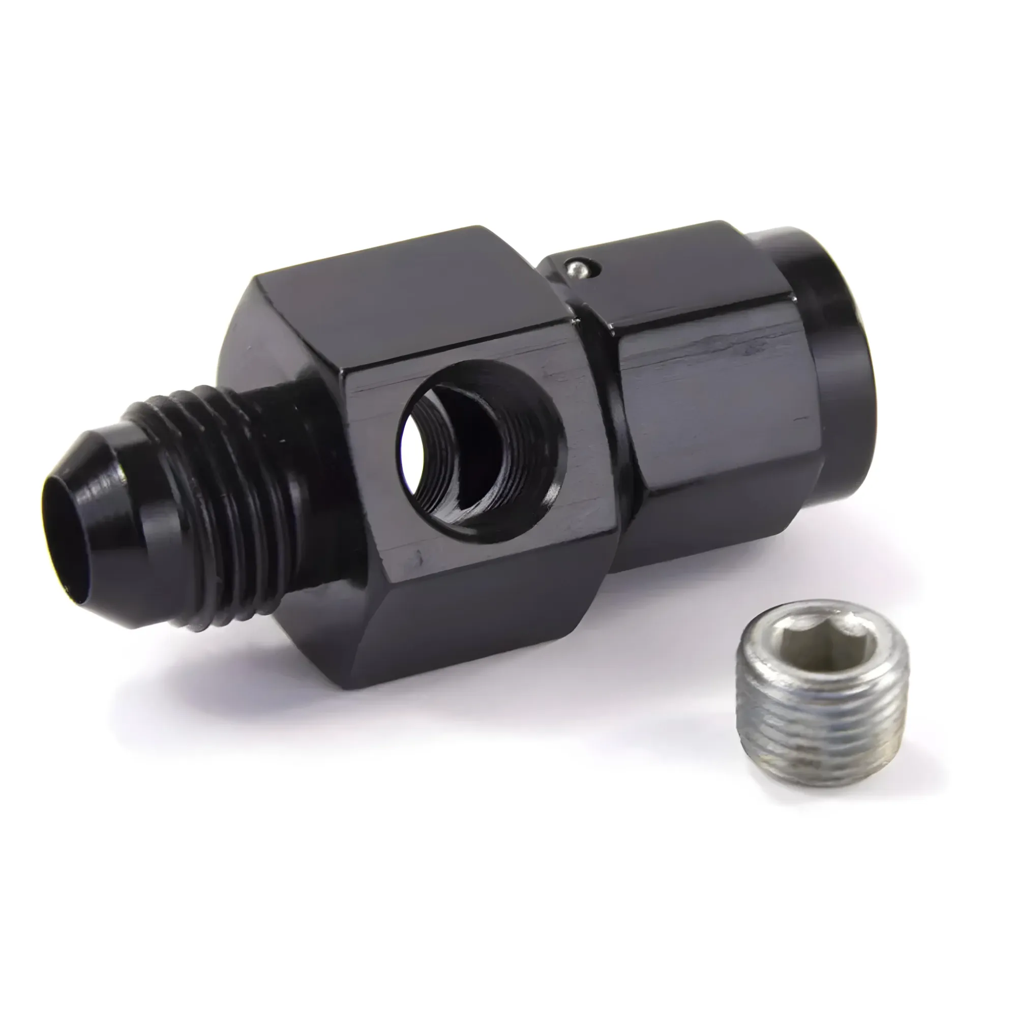 This black anodized aluminum swivel manifold allows you to screw it onto a fitting without having to spin the whole manifold. This swivel manifold has dual 1/8" NPT ports which allows you to connect a nitrous gauge, fuel pressure gauge, or any 1/8" NPT accessory in-line with a 6AN line. (Includes one 1/8" NPT hex plug.)