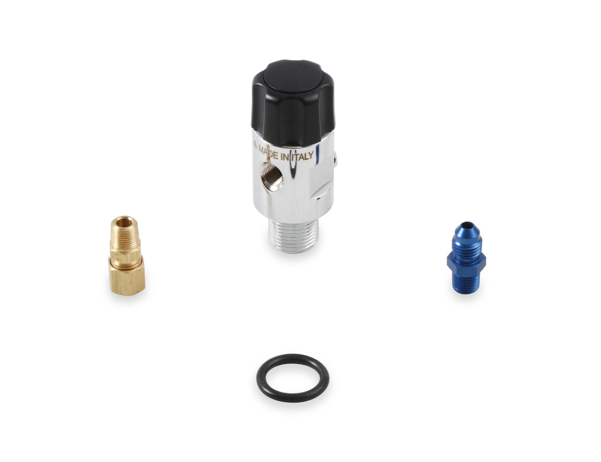 Valve kit includes a pre-installed PRD (Pressure Relief Device), a new O-ring seal as well as a blue 1/8" to -4 AN line fitting & brass siphon tube adapter.