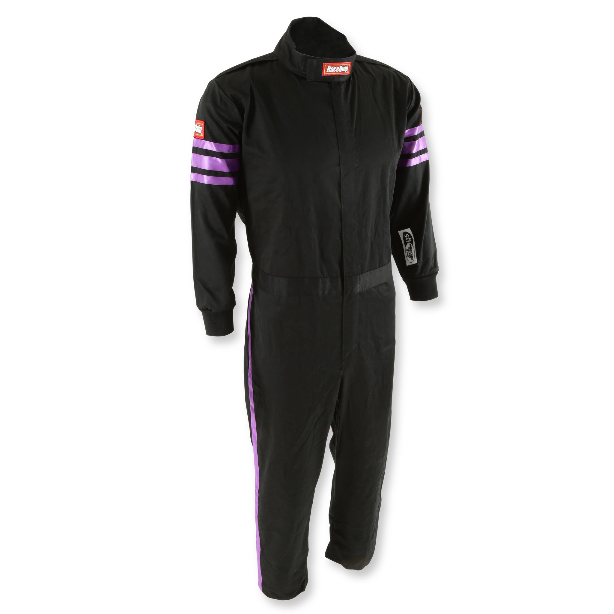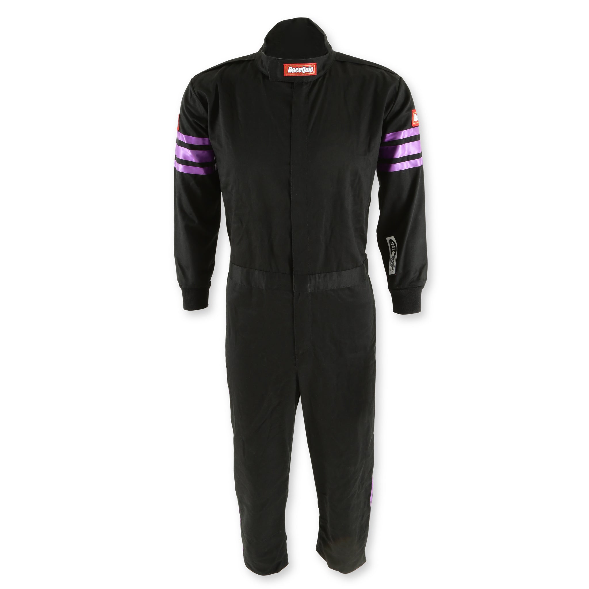 The RaceQuip Youth single-layer SFI-1 racing suit is made from Pyrovatex® FRC material. Note that sometimes these suits are referred to as "fireproof" racecar driver's suits, but actually all auto racing safety gear is "fire retardant". Pyrovatex® offers the maximum combination of overall flame and heat protection, durability and comfort for the price. This fire-retardant cotton based (FRC) material is used because it retains the softness and breathability of cotton and will wick away moisture from the skin. Pyrovatex® fabric is gentle and non-irritating to even the most sensitive skin. The treatment process leaves the exterior surface shiny and supple. Since the Pyrovatex® process combines a chemical agent with the raw cotton fibers to create a bond at the molecular level, with proper care, the suit will retain its flame-retardant properties beyond the useful life of the garment. All racing suits are assembled with heavy-duty, multi-needle, over-lock safety stitch machines to provide exceptional seam strength. RaceQuip suits feature a high-quality heavy duty Nomex® backed brass zipper installed with a double overlap for a more secure front opening. Stylish contrasting armband stripes match the full-length leg stripes.