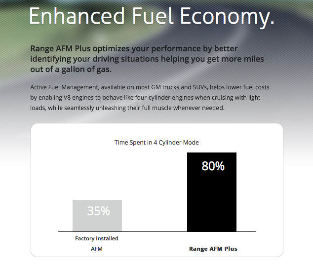 Active Fuel Management, available on most GM trucks and SUVs, helps lower fuel costs by enabling V8 engines to behave like four-cylinder engines when cruising with light loads, while seamlessly unleashing their full muscle whenever needed. The AFM+ device allows the vehicle to run in 4 cylinder mode more often, for improvements in efficiency.