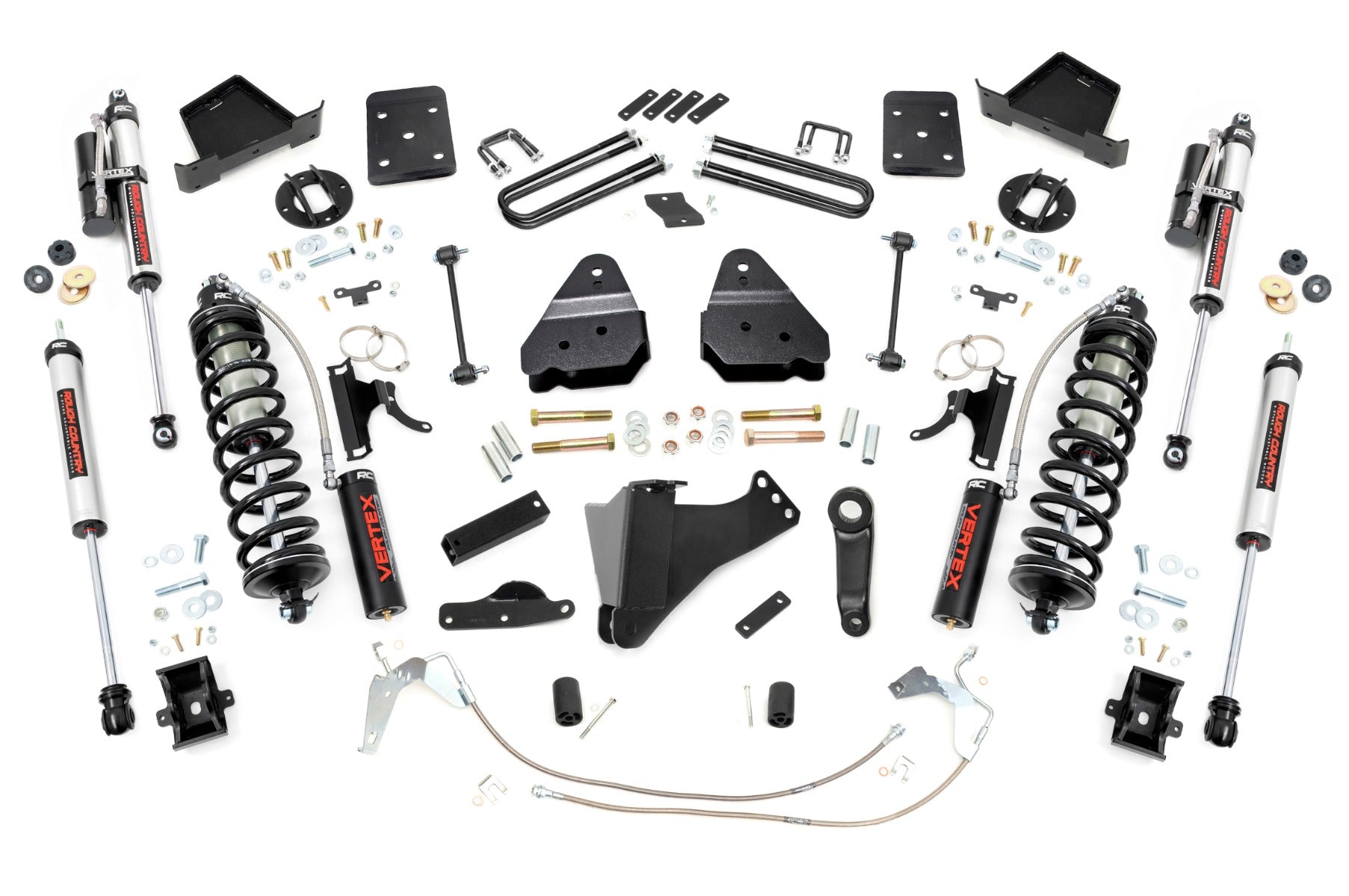 Explore New Heights. Give your second-generation Ford Super Duty superior lift height with Rough Country's 4.5-inch Coilover Suspension Lift Kit! This all-inclusive kit comes with everything you need for a total transformation of your truck. Run up to 35in tires while preserving the smooth, factory ride quality with this impressive upgrade.\Durable Components. When changing a vehicle's suspension, the key to preserving ride quality is keeping the geometry of all suspension components as close to their factory angles as possible. Rough Country's new 4.5-inch Suspension Lift features a set of ultra-durable radius arm drop brackets, precision fit to bolt right into the factory mounts for an easier install and a more factory-like angle. Utilizing this conversion kit you're removing the factory independent coil shock and coil set-up and replacing it with a massive 2.5in piston, nitrogen-charged, 8-stage adjustable Vertex Coilover. Rough CountryΓÇÖs Vertex Coilovers feature a monotube design with an external reservoir for increased oil capacity and damping sensitivity. When it comes to investing in a high-end kit, youΓÇÖll be pleased to find that Rough CountryΓÇÖs 2.5in piston design is beefier and offers an impressive 56% greater fluid capacity than the average reservoir shock. Each kit is paired with a monotube shock that provides optimal damping control.\Installation. Requiring cutting and drilling to install, an estimated timeframe of 6-10 hours is recommended to complete this full installation. This full kit can be installed at home and can be completed efficiently and quickly!\Limited Lifetime Replacement Warranty. Rough Country's 4.5-inch Coilover Suspension Lift Kit is backed with a limited lifetime replacement warranty towards manufacturer defects. As such, the product is protected from structural and workmanship damage after the date of purchase. With our industry-leading warranty give yourself peace of mind when using Rough Country's Suspension products!