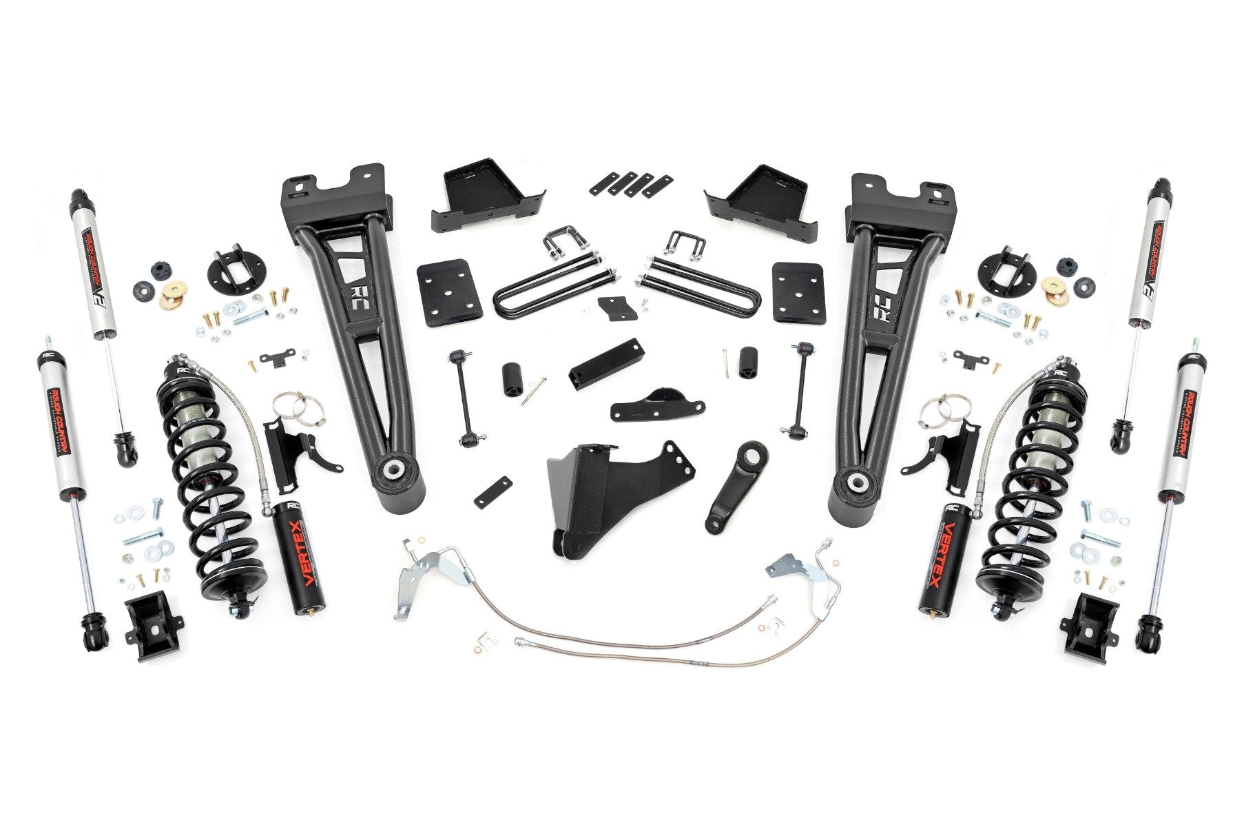 Superior Ride Quality. Take your second-generation Ford Super Duty to new heights with Rough Country's 6-inch Radius Arm Coilover Conversion Suspension Lift! This all-inclusive kit comes with everything you need for a total transformation of your truck. Run up to 37in tires while preserving the smooth, factory ride quality with this impressive upgrade.\Durable Components. When changing a vehicle's suspension, the key to preserving ride quality is keeping the geometry of all suspension components as close to their factory angles as possible. Rough Country's new 6-inch Radius Arm Suspension Lift features a set of ultra-durable Radius Arms, precision fit to bolt right into the factory mounts for an easier install and a more factory-like angle. At 27lbs each, these beefy, upgraded Radius Arms dwarf stock equipment and feature durable durable rubber bushings for maximum vibration absorption. Rough CountryΓÇÖs 6" Radius Coilover Conversion Lift Kit features top-mounted reservoir brackets and coil-over mounts constructed from 1/4-inch steel. Utilizing this conversion kit you're removing the factory independent coil shock and coil set-up and replacing it with a massive 2.5in piston, nitrogen-charged, 8-stage adjustable Vertex Coilover. Rough CountryΓÇÖs Vertex Coilovers feature a monotube design with an external reservoir for increased oil capacity and damping sensitivity. When it comes to investing in a high-end kit, youΓÇÖll be pleased to find that Rough CountryΓÇÖs 2.5in piston design is beefier and offers an impressive 56% greater fluid capacity than the average reservoir shock. Each kit is paired with a monotube shock that provides optimal damping control.\Installation. Requiring cutting and drilling to install, an estimated timeframe of 6-10 hours is recommended to complete this full installation. This full kit can be installed at home and can be completed efficiently and quickly!\Limited Lifetime Replacement Warranty. Rough Country's 6-inch Radius Arm Coilover Conversion Suspension Lift Kit is backed with a limited lifetime replacement warranty towards manufacturer defects. As such, the product is protected from structural and workmanship damage after the date of purchase. With our industry-leading warranty give yourself peace of mind when using Rough Country's Suspension products!
